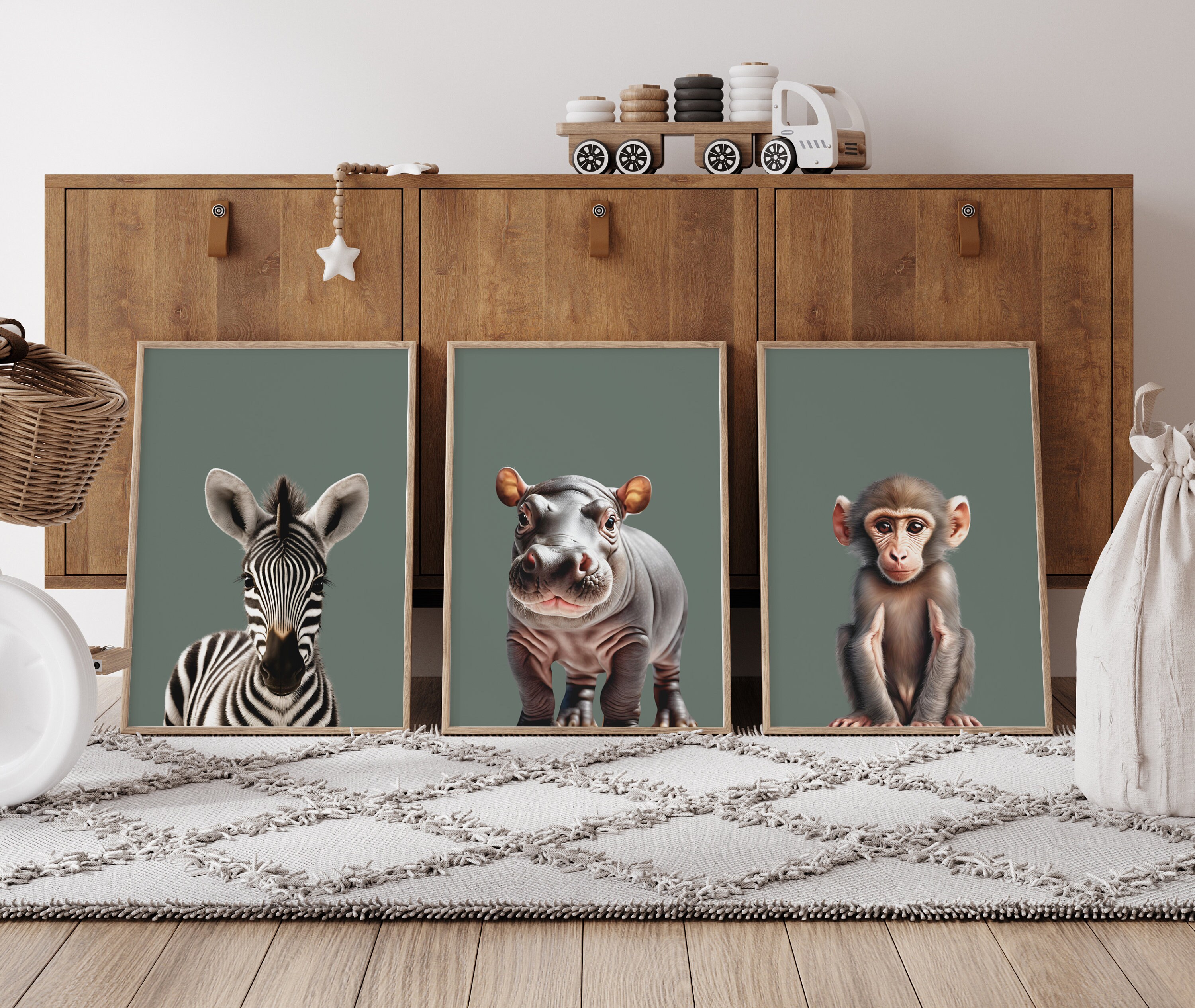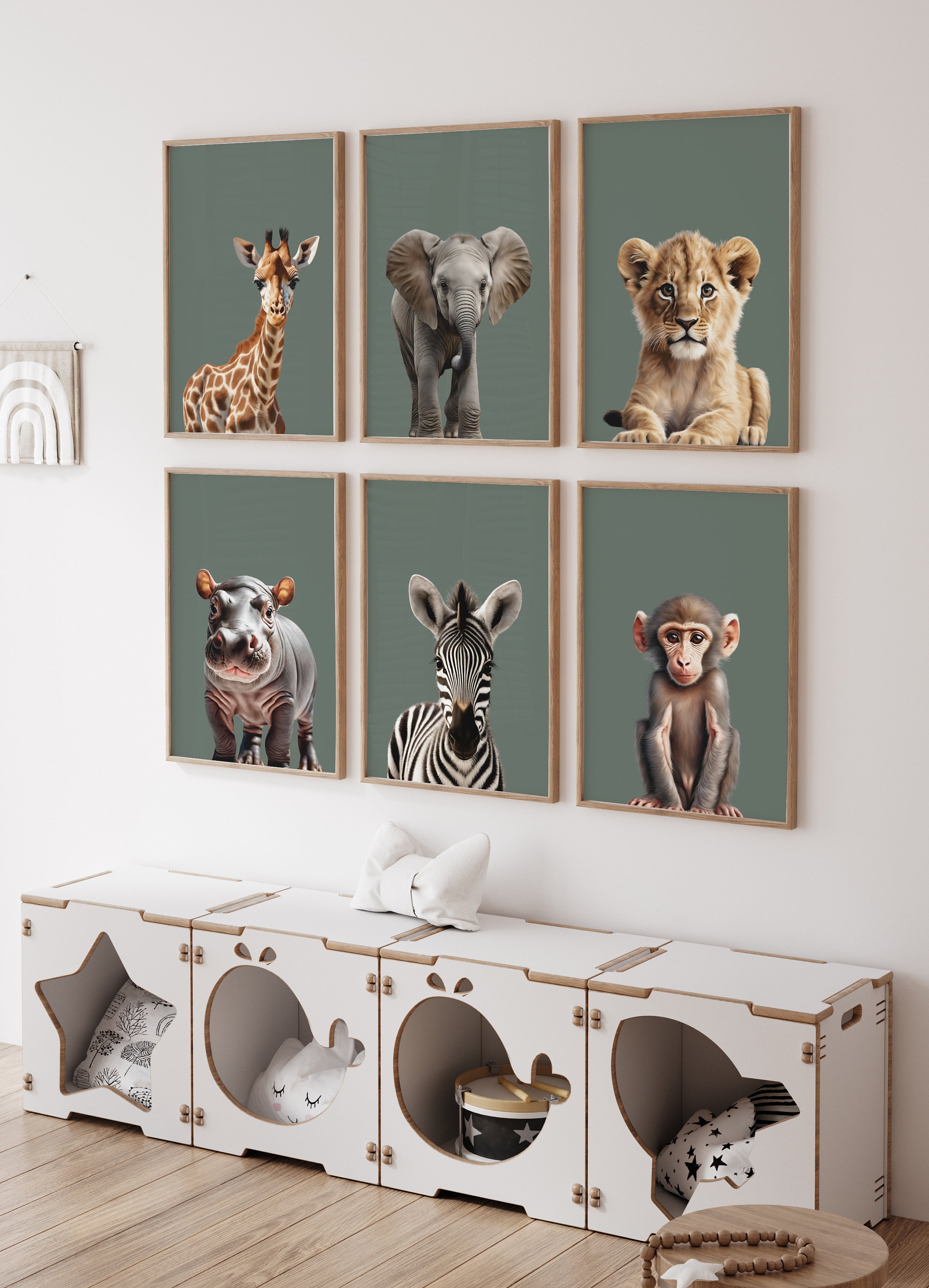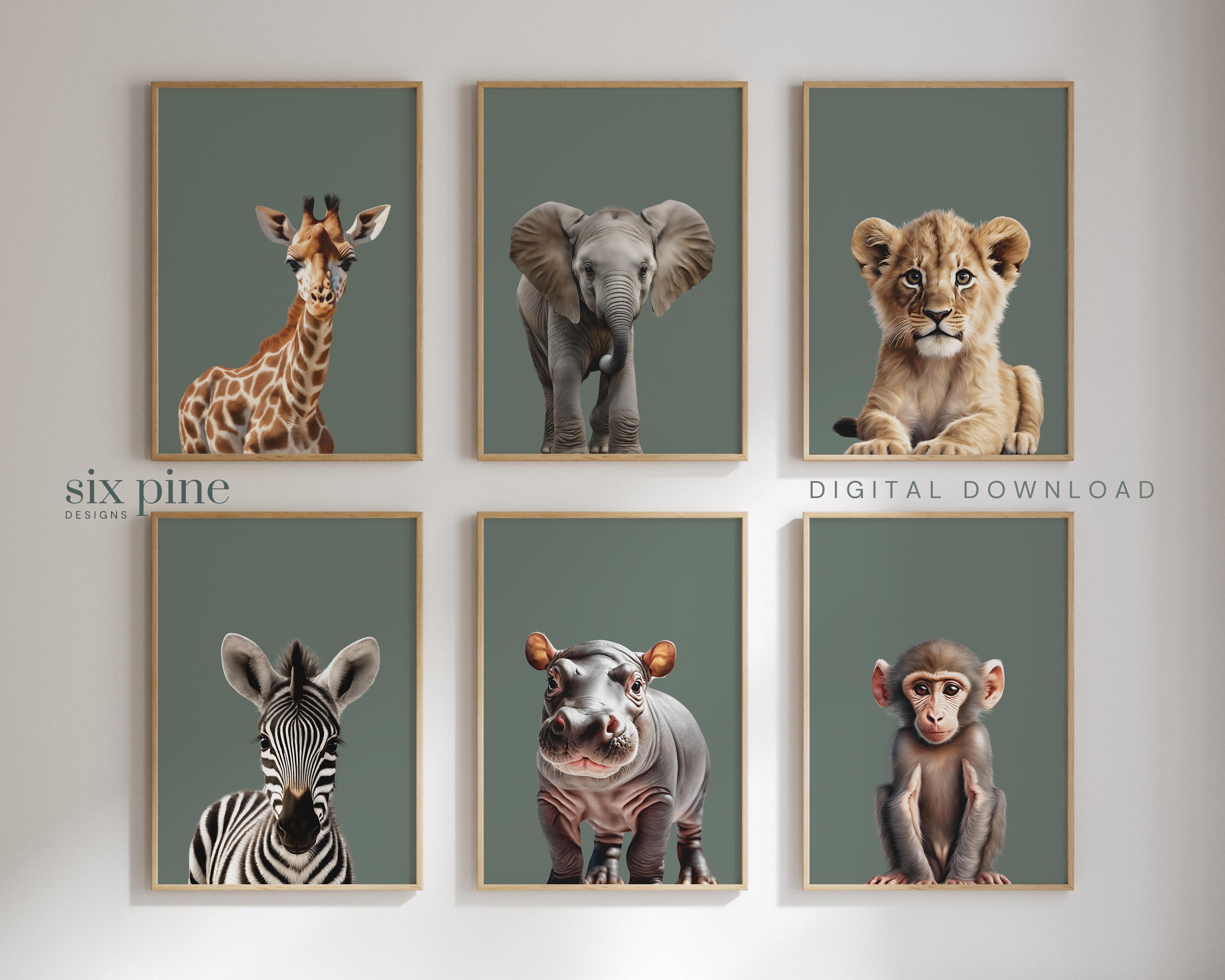 This wall art set of 6 digital prints featuring Gender Neutral Safari Baby Animals giraffe, elephant, lion, zebra, hippo, and baboon on a Sage Green background is the perfect addition to your Kids Room or Baby Nursery.