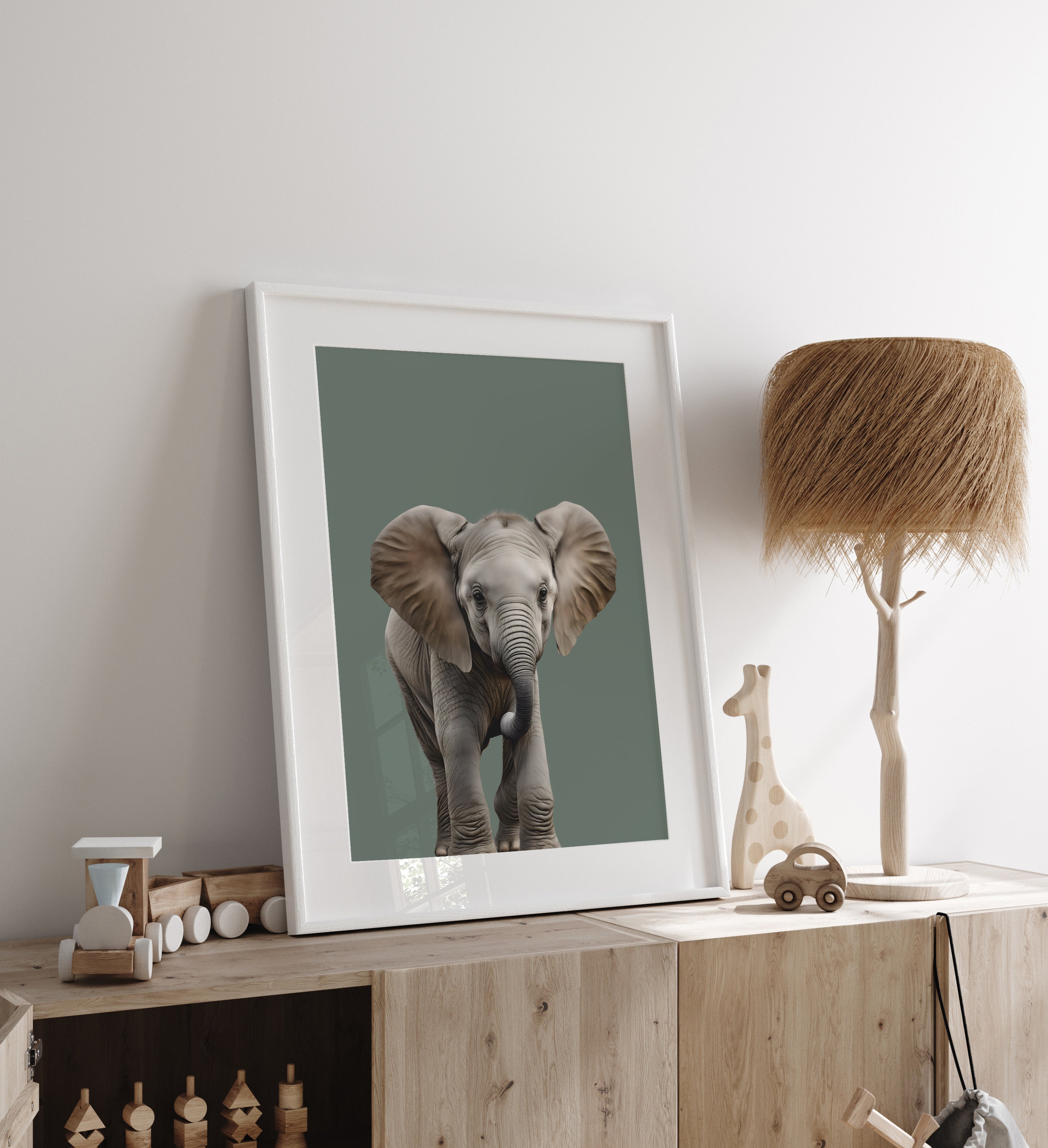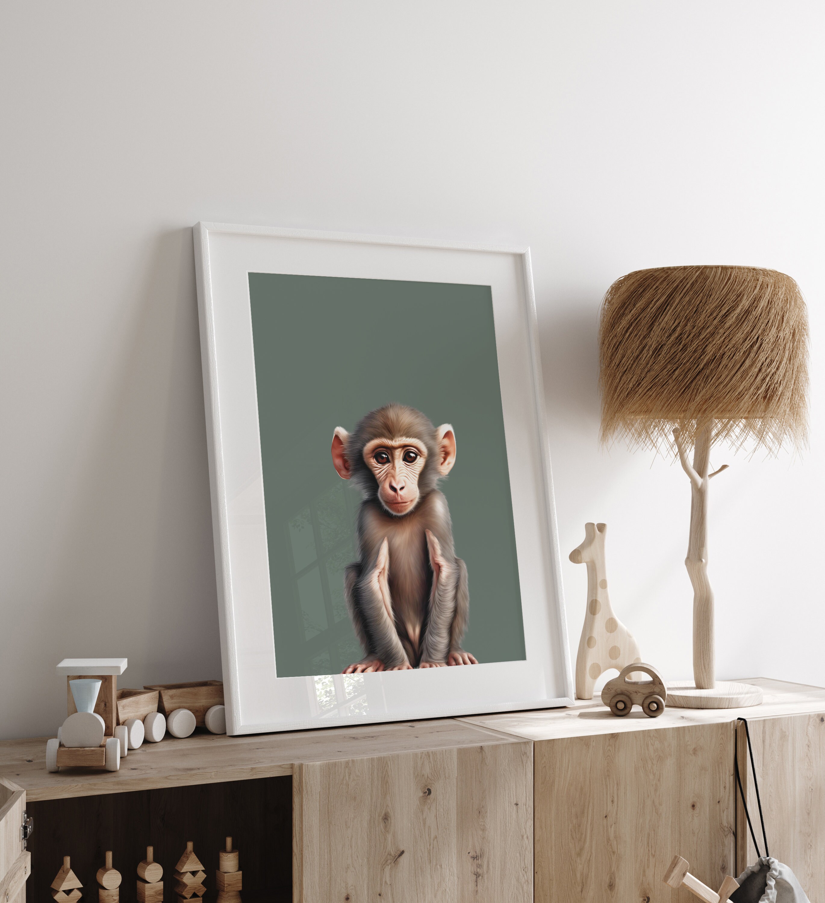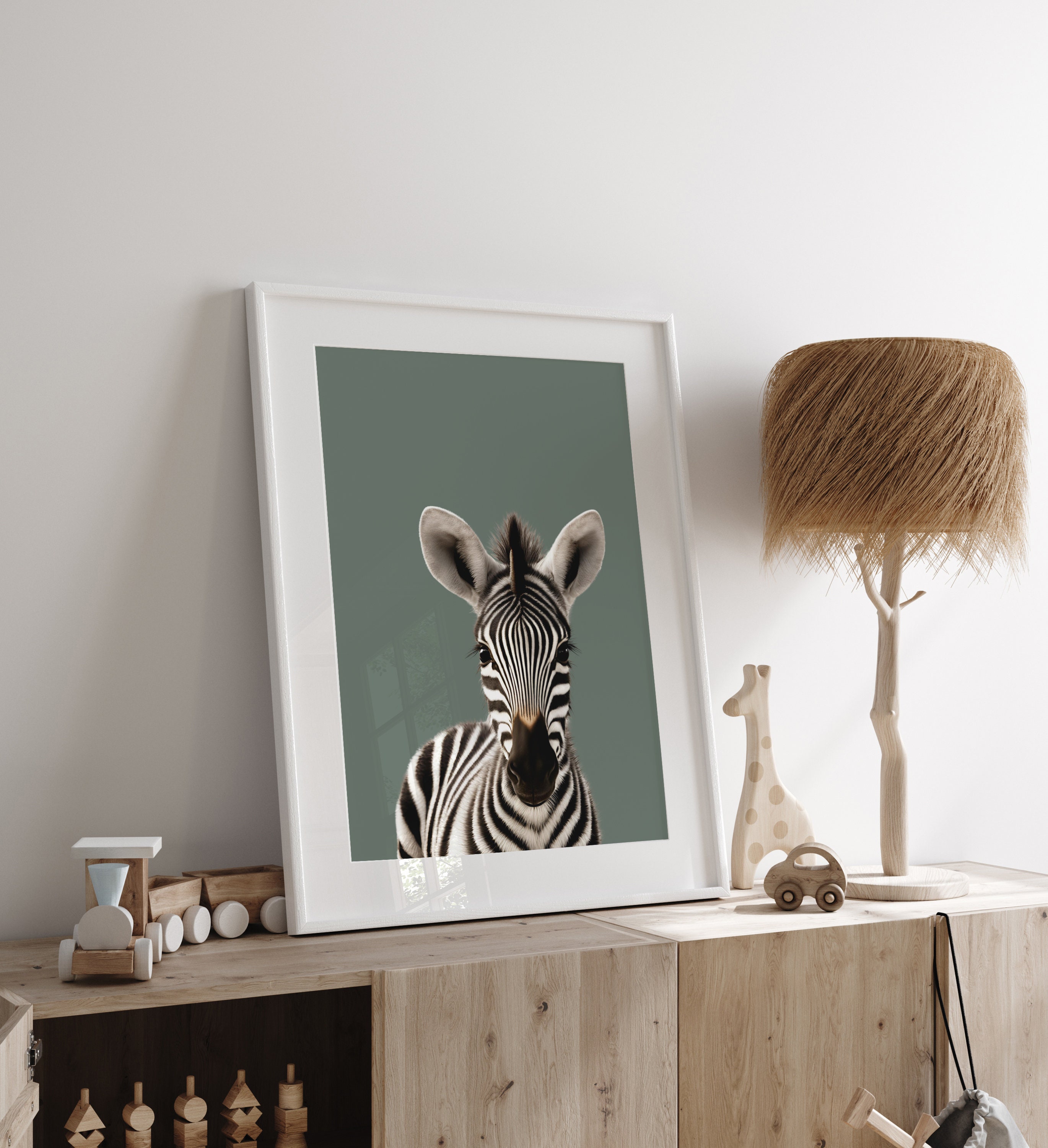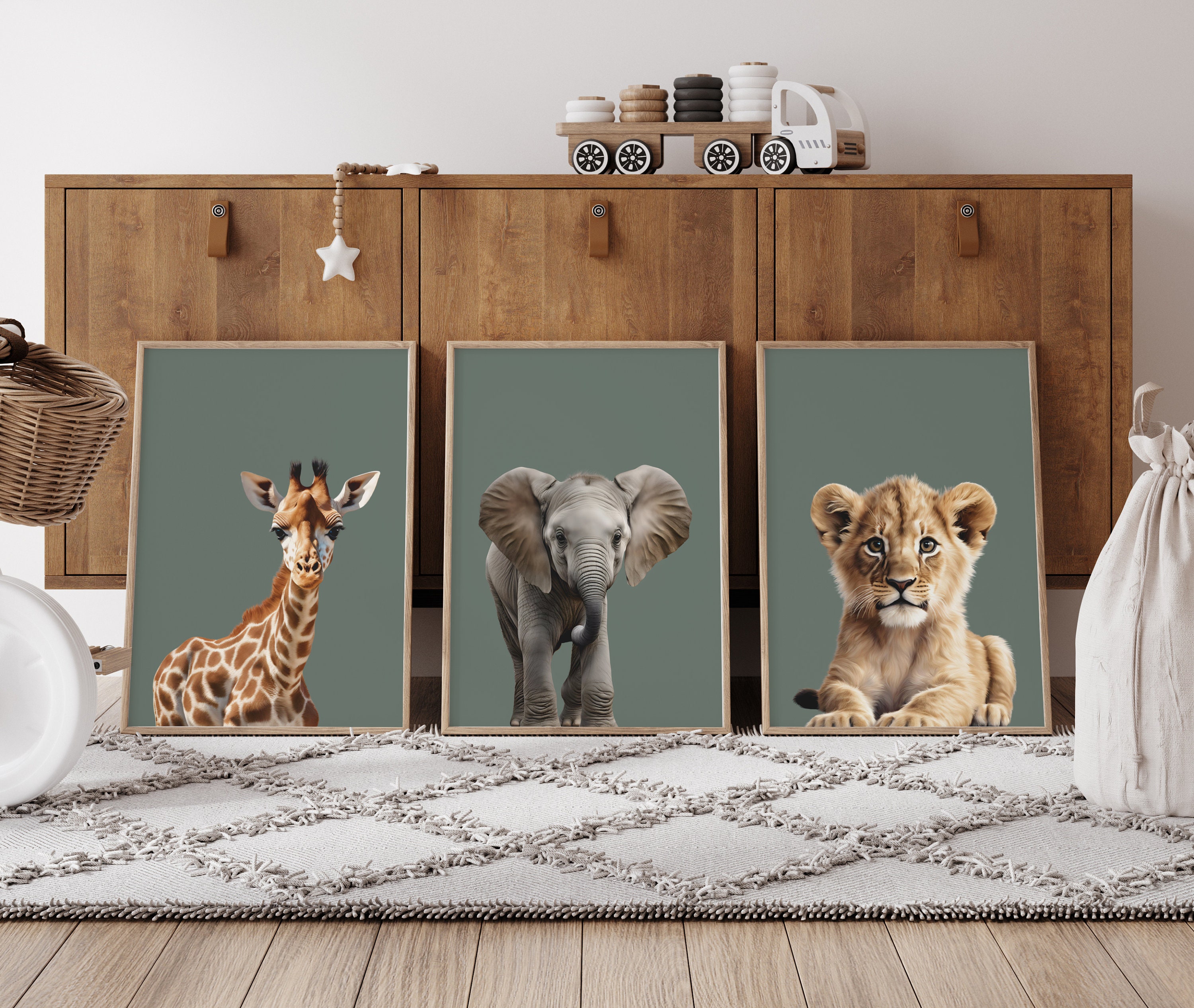This wall art set of 6 digital prints featuring Gender Neutral Safari Baby Animals giraffe, elephant, lion, zebra, hippo, and baboon on a Sage Green background is the perfect addition to your Kids Room or Baby Nursery.