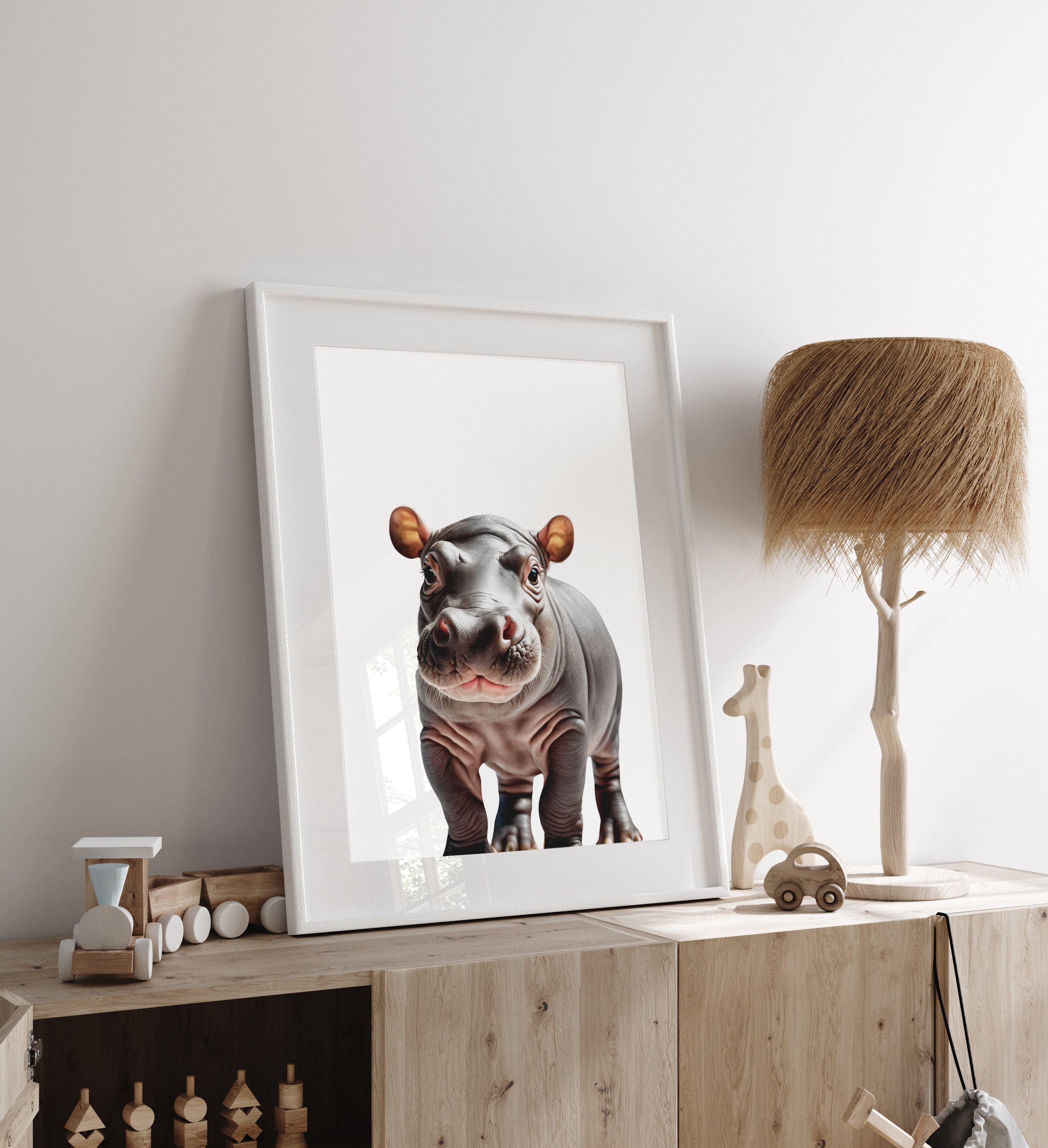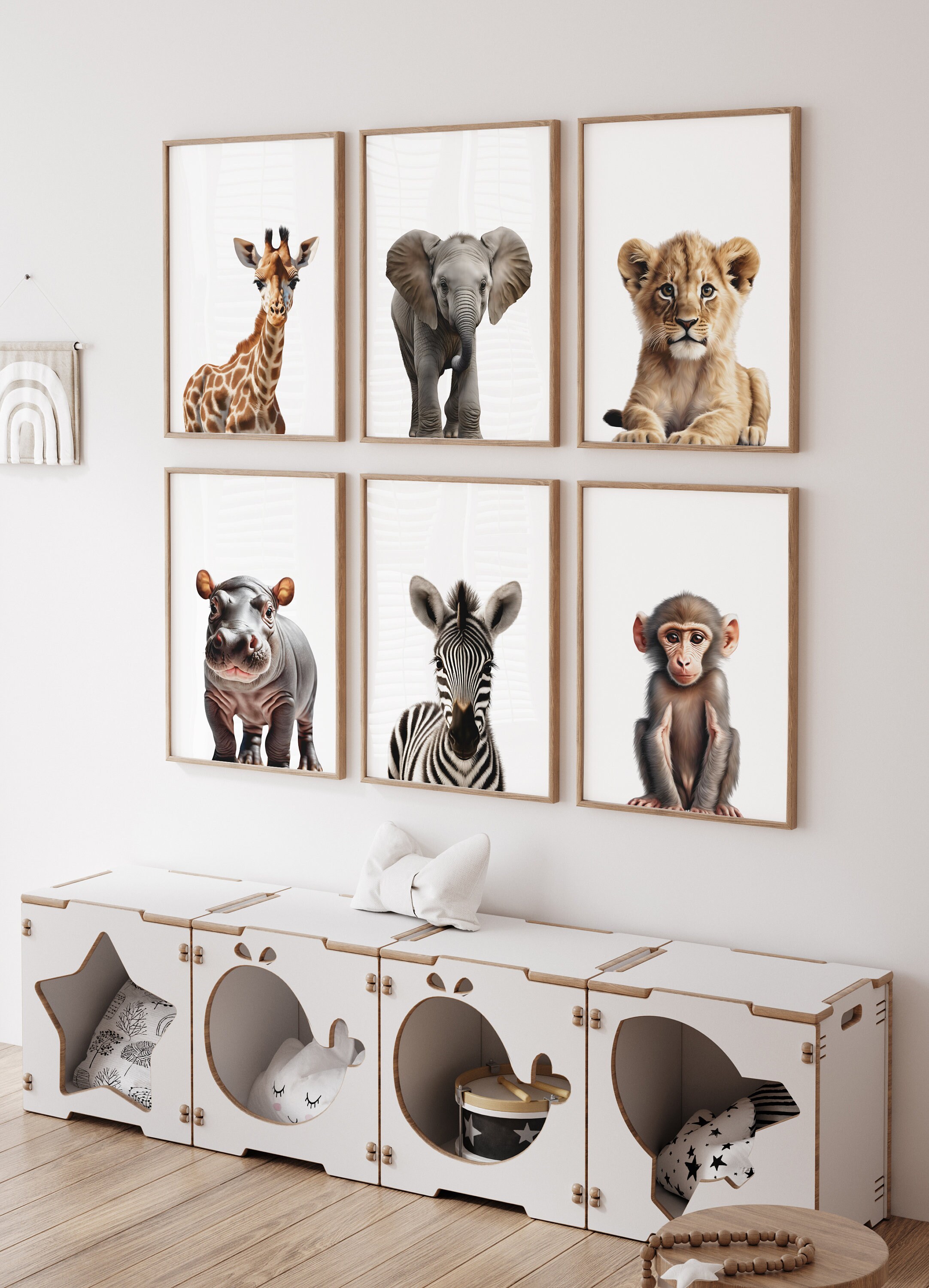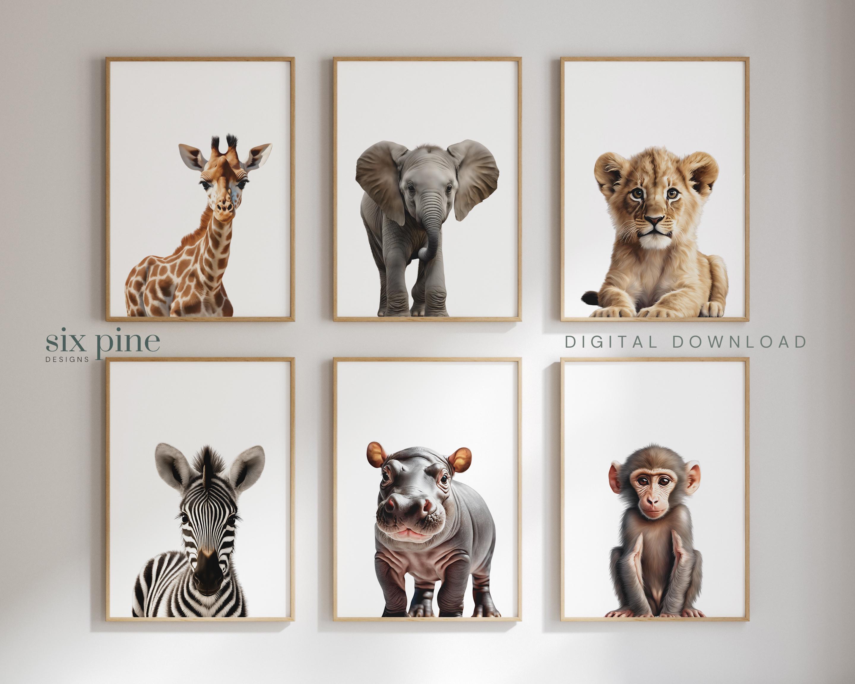 This wall art set of 6 digital prints featuring Gender Neutral Safari Baby Animals giraffe, elephant, lion, zebra, hippo, and baboon on a White background is the perfect addition to your Kids Room or Baby Nursery.