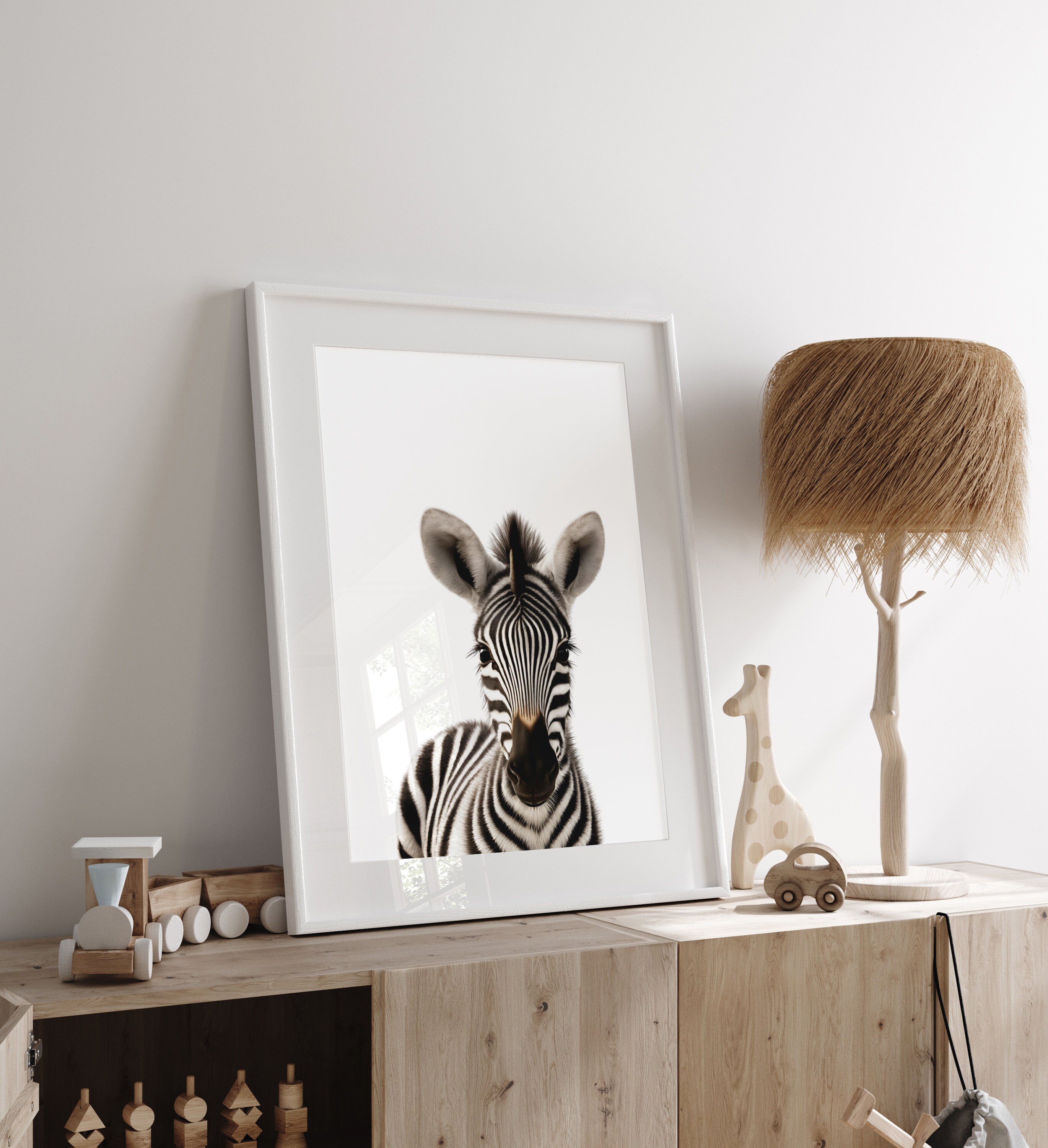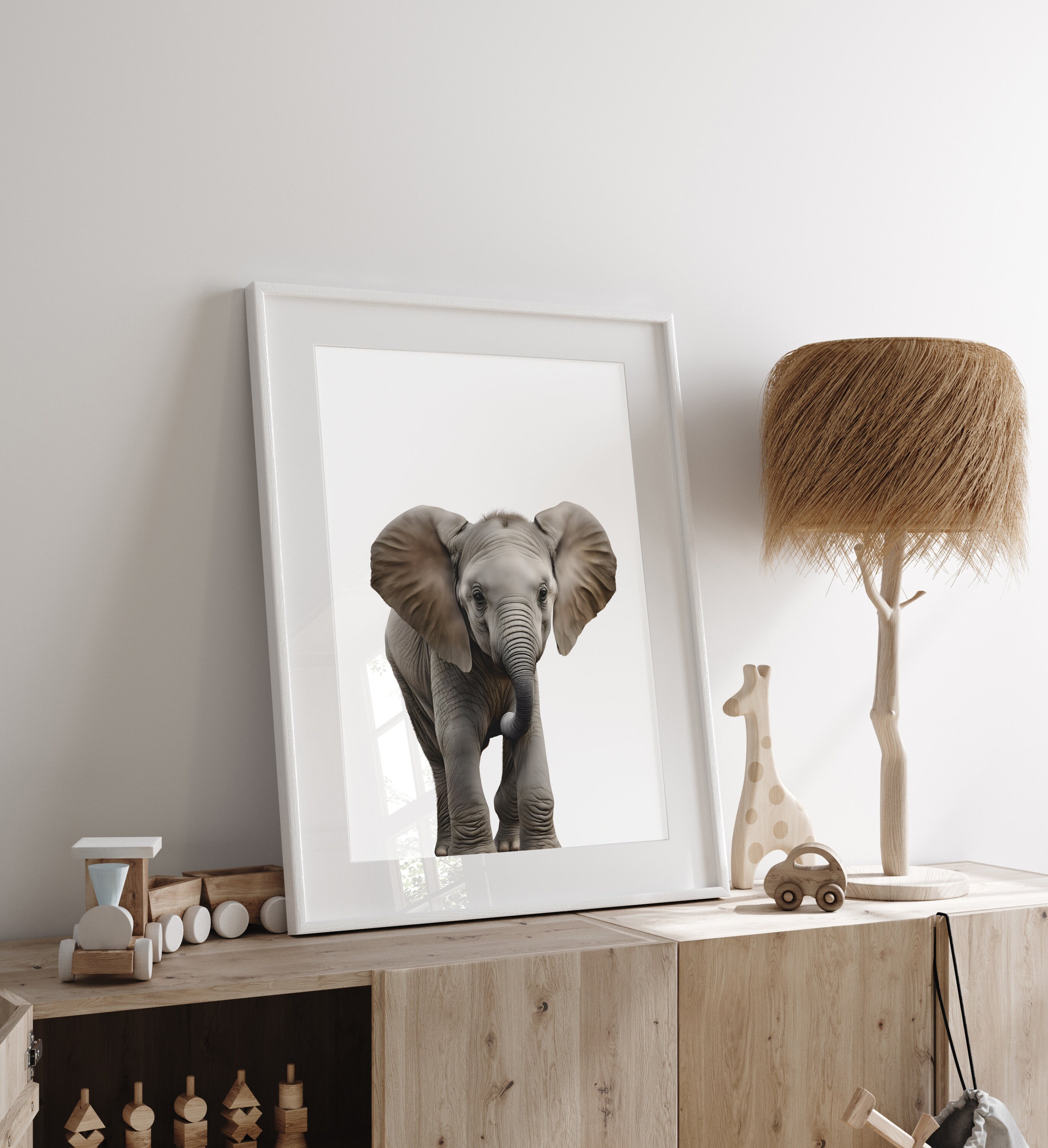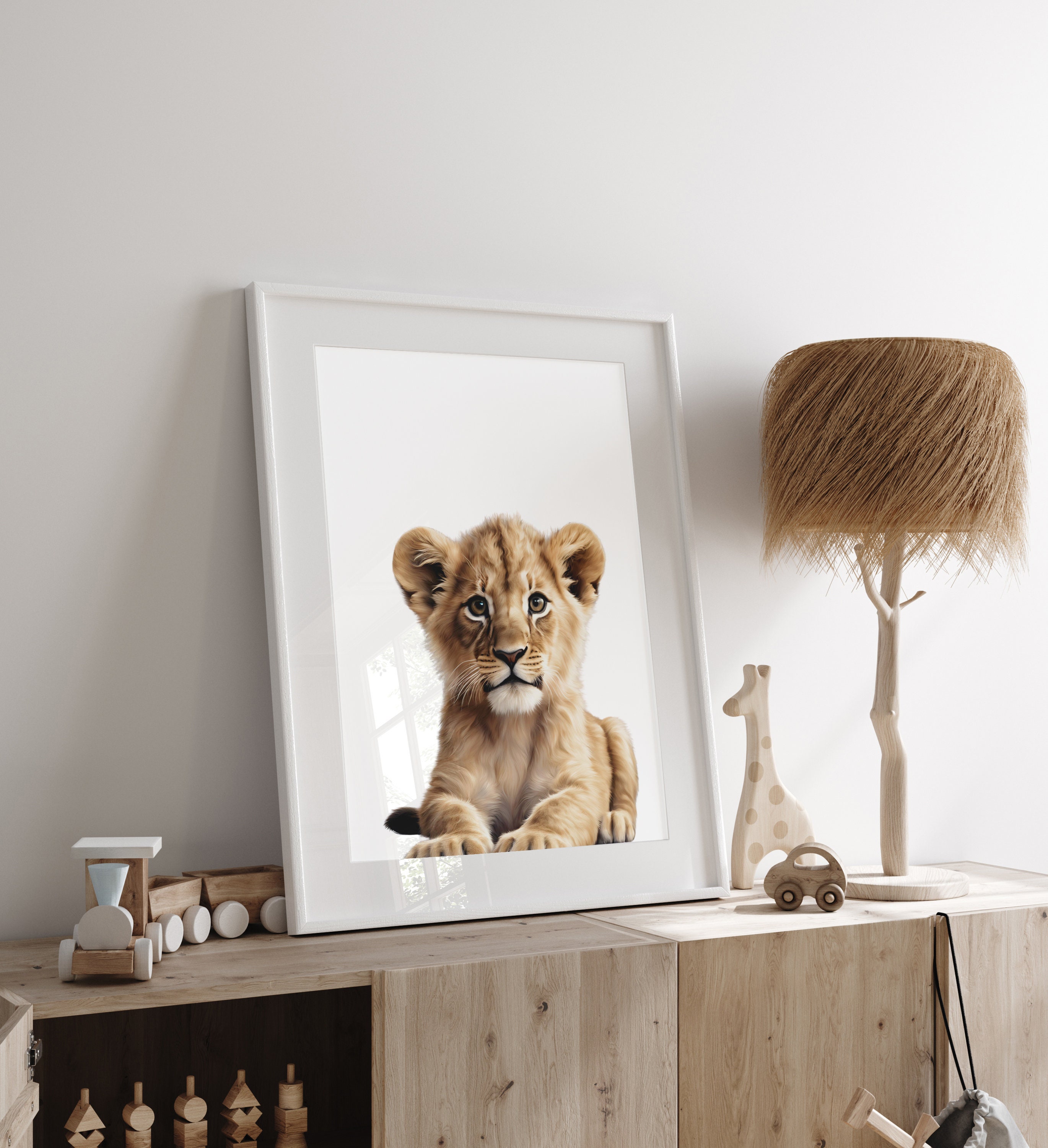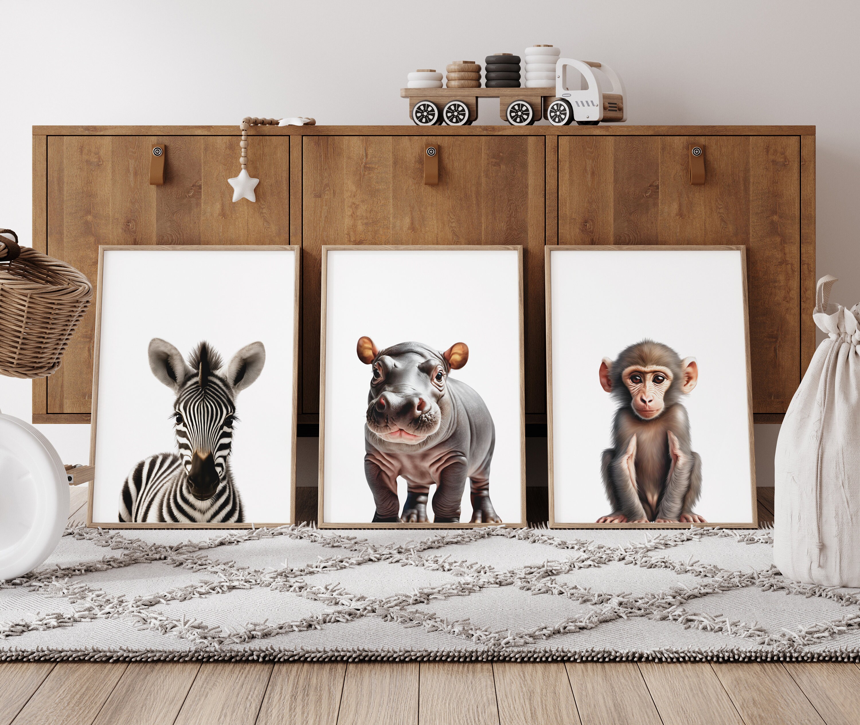 This wall art set of 6 digital prints featuring Gender Neutral Safari Baby Animals giraffe, elephant, lion, zebra, hippo, and baboon on a White background is the perfect addition to your Kids Room or Baby Nursery.