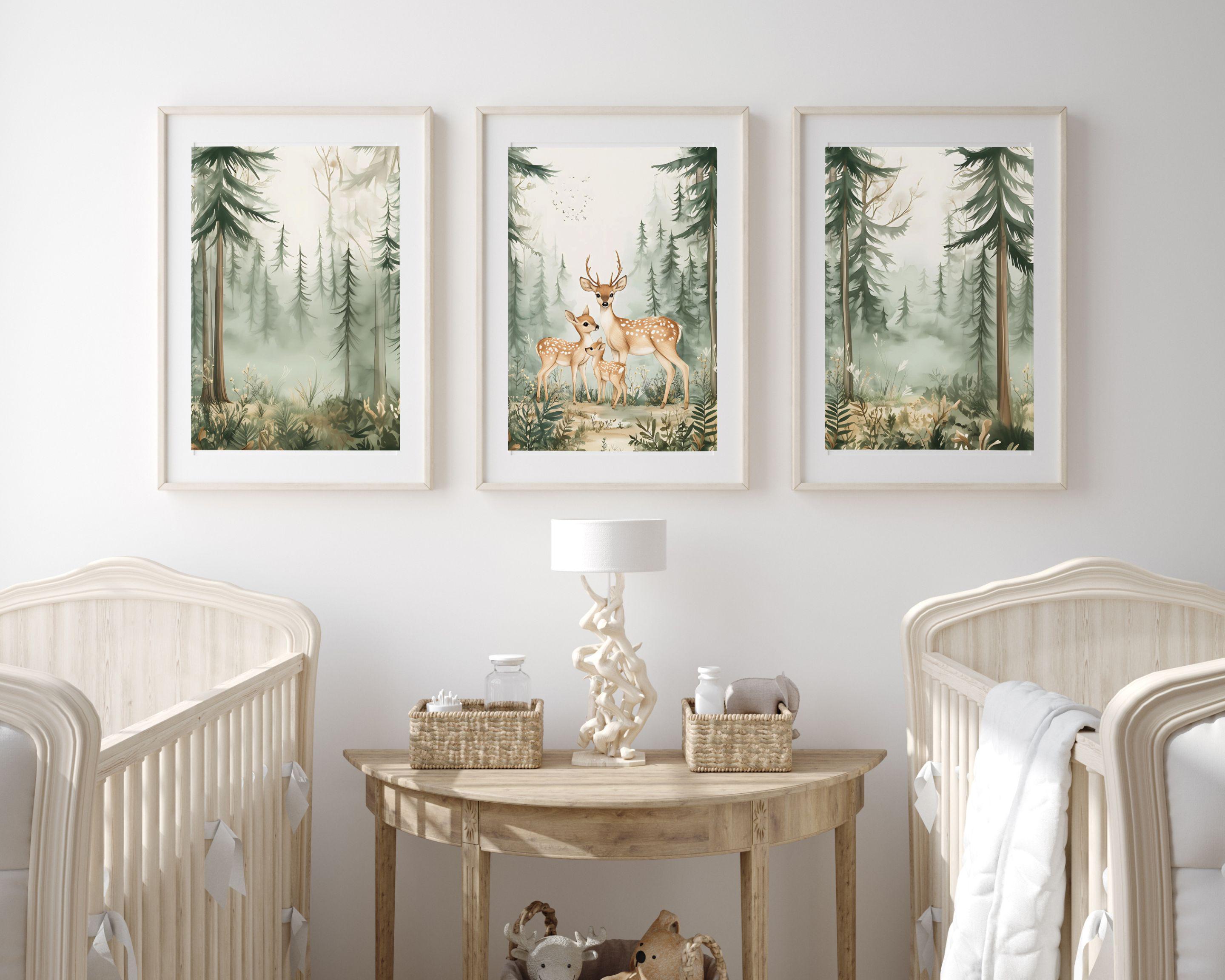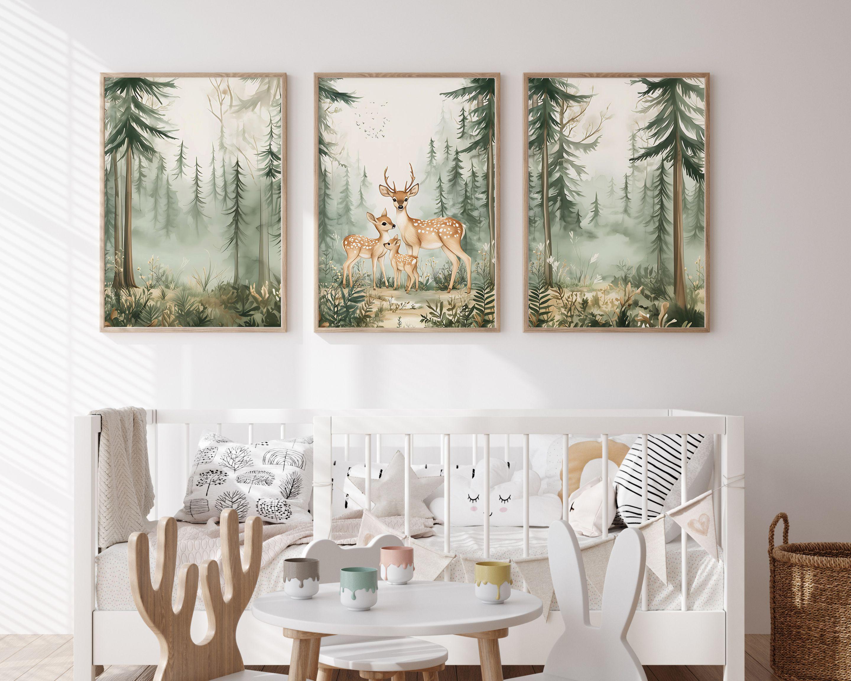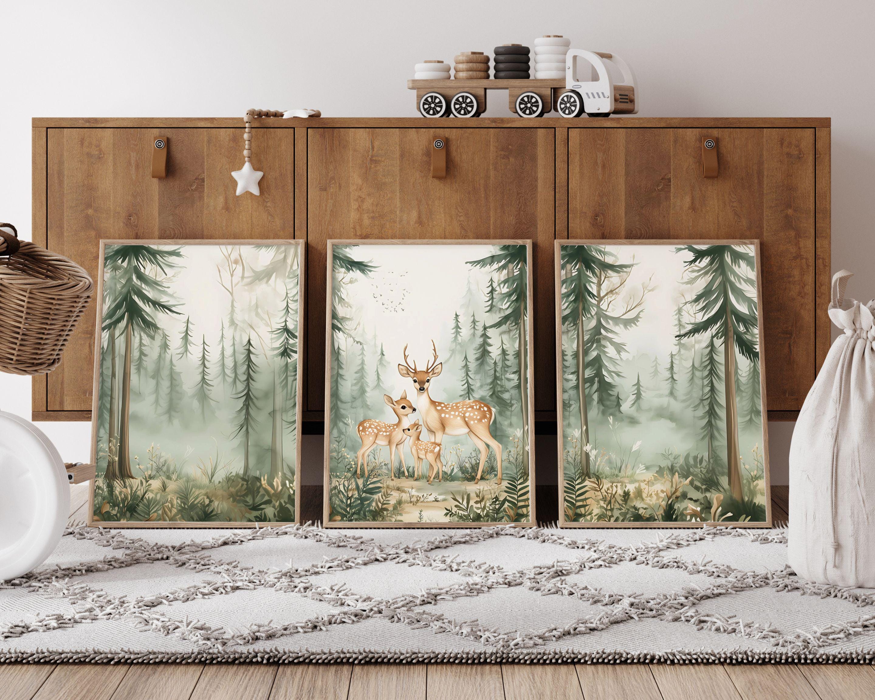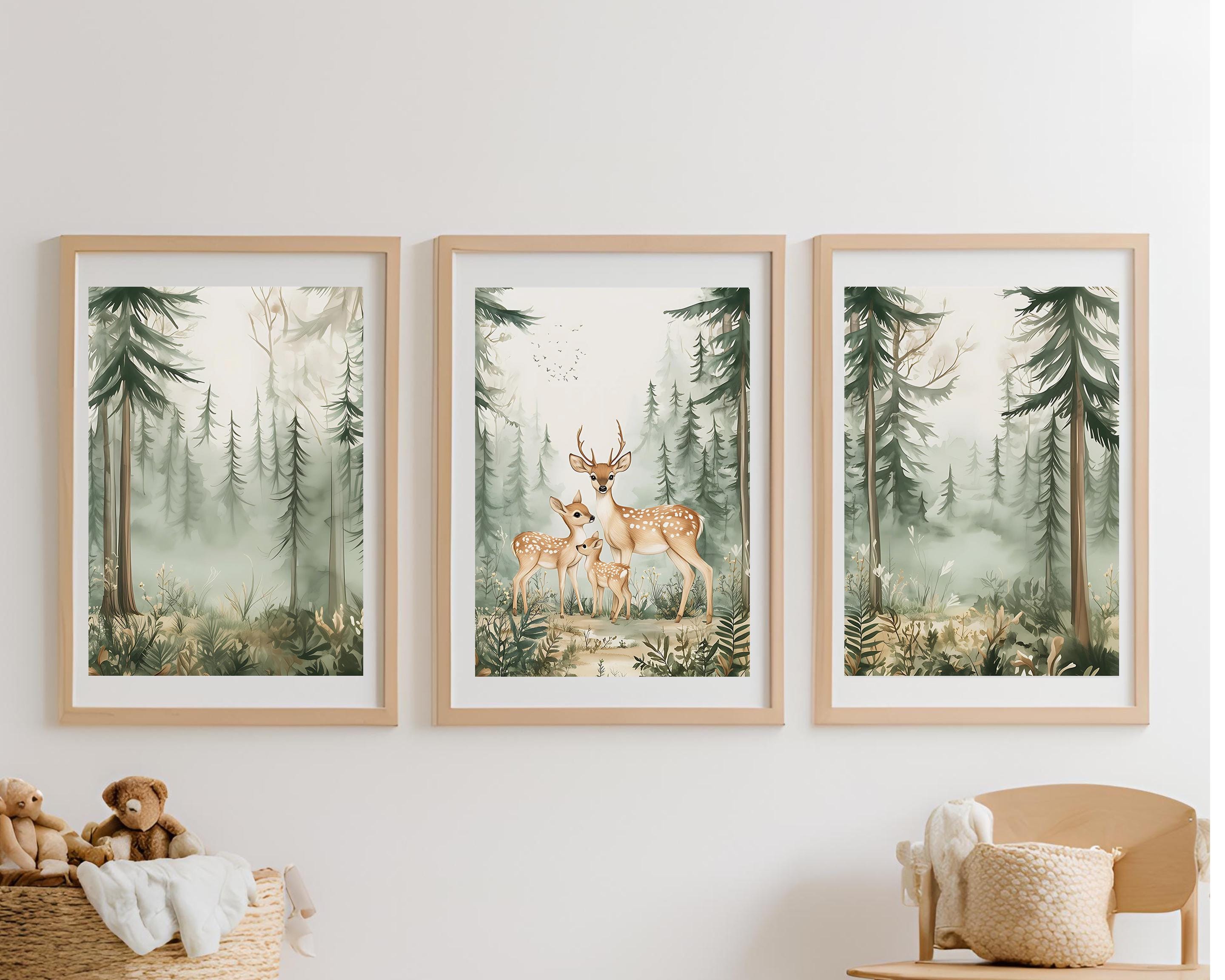 Bring the serene beauty of nature into your child's space with this enchanting set of 3 woodland deer family prints. Featuring a gentle forest backdrop and a sweet deer family, these watercolor-style digital prints are perfect for adding warmth and natural charm to any nursery or kids' room. The soft, calming tones of the forest scene make these prints ideal for creating a peaceful environment.