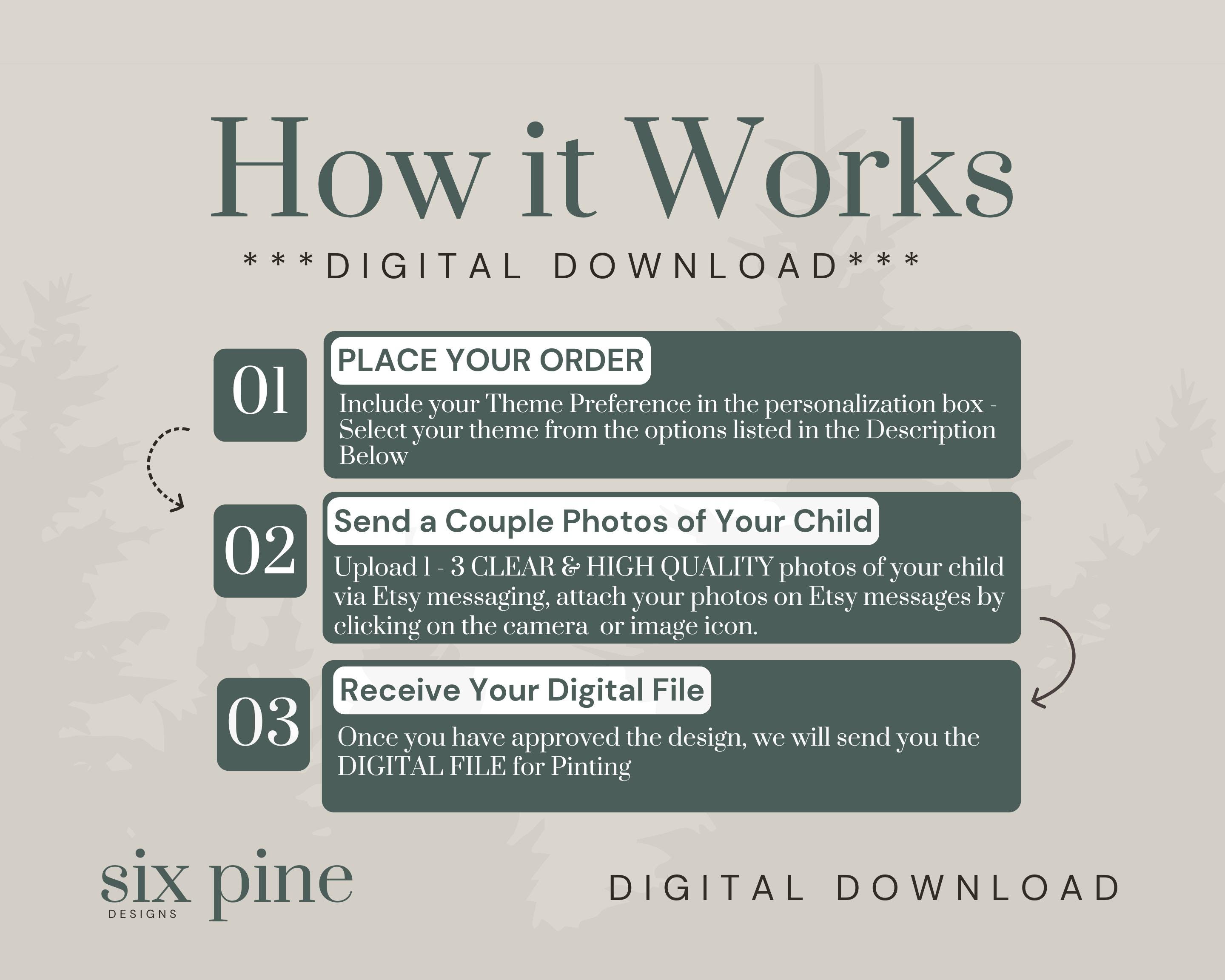 1: Place Your Order – Include your Theme Preference in the personalization box (Unicorn, Explorer, Mermaid, Fairy, Astronaut, Sport). If you have something unique in mind, please message us before purchasing! 2: Send a Photo of Your Child – Upload 1 - 3 CLEAR & HIGH-QUALITY photos via Etsy messaging. (See below for photo tips!) 3: We Create the Magic – You’ll receive a proof within 2-5 working days to review. You can approve the artwork or request up to 5 free adjustments. 4: Receive Your Digital Art – Your custom artwork will be delivered in a high-resolution digital file, perfect for printing and framing!