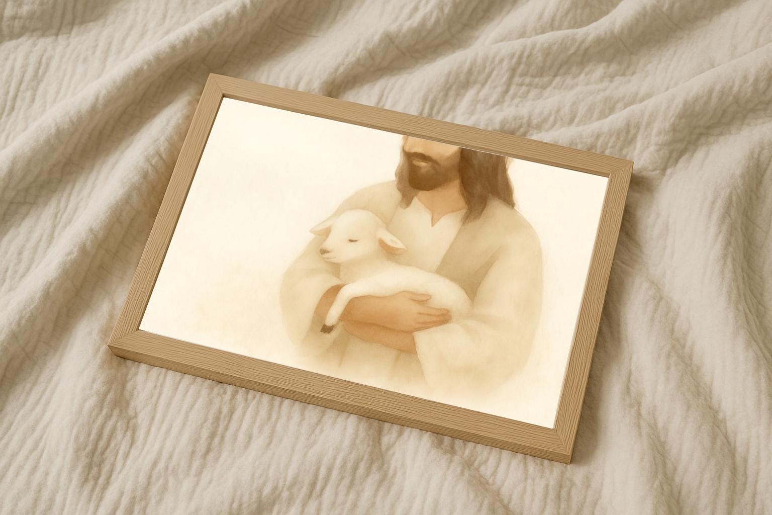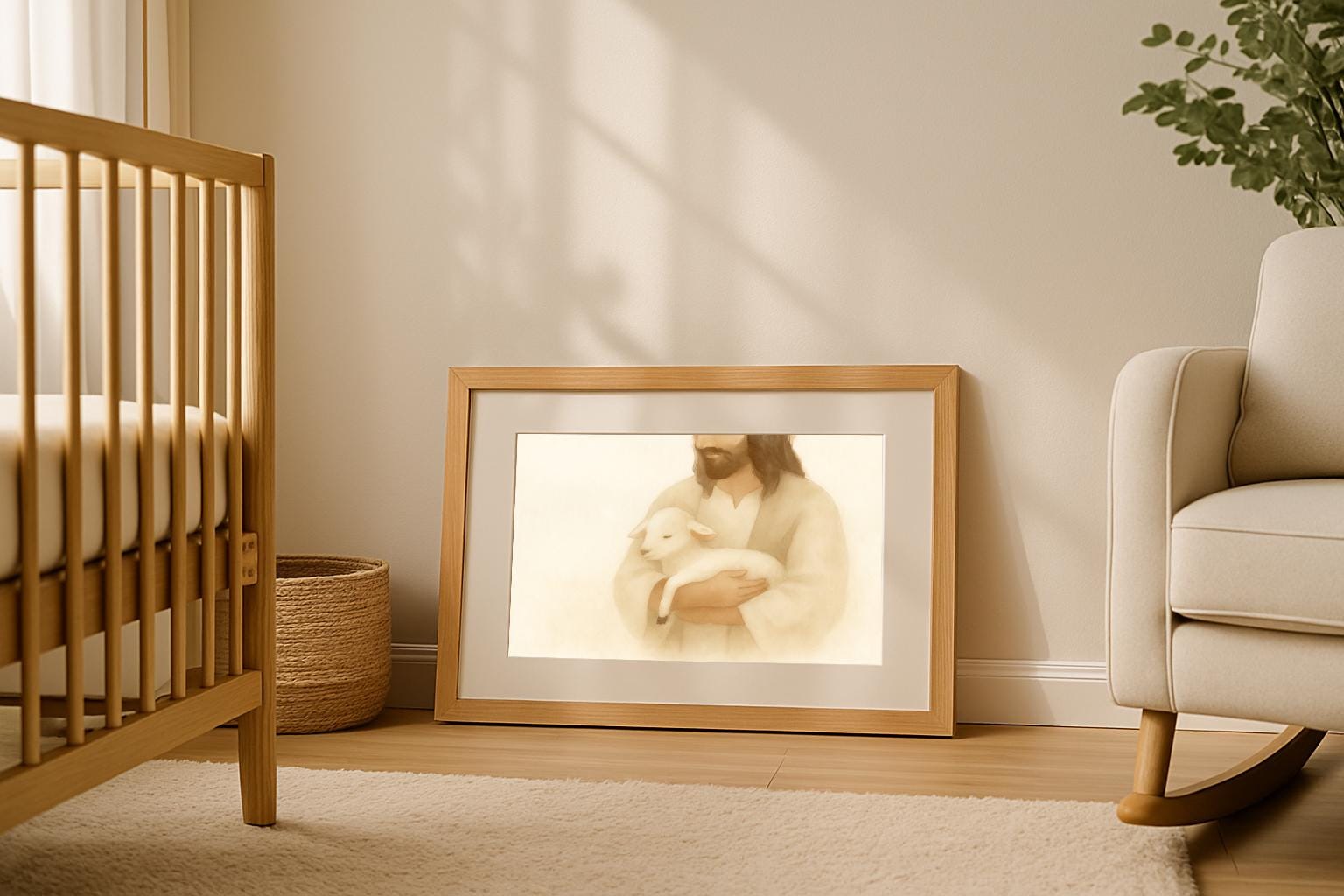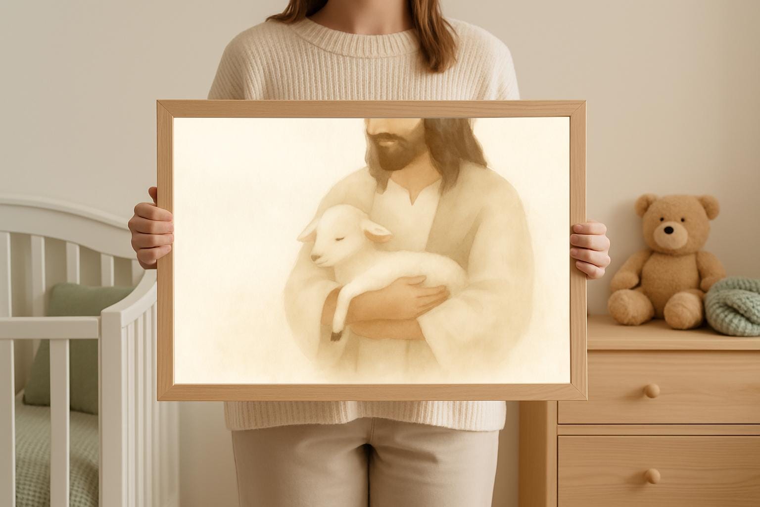 Introduce serenity and faith into your child's space with this Jesus Holding Lamb Printable. This Christian nursery wall art captures the tender moment of the Gentle Savior cradling a lamb, symbolizing purity and divine love.