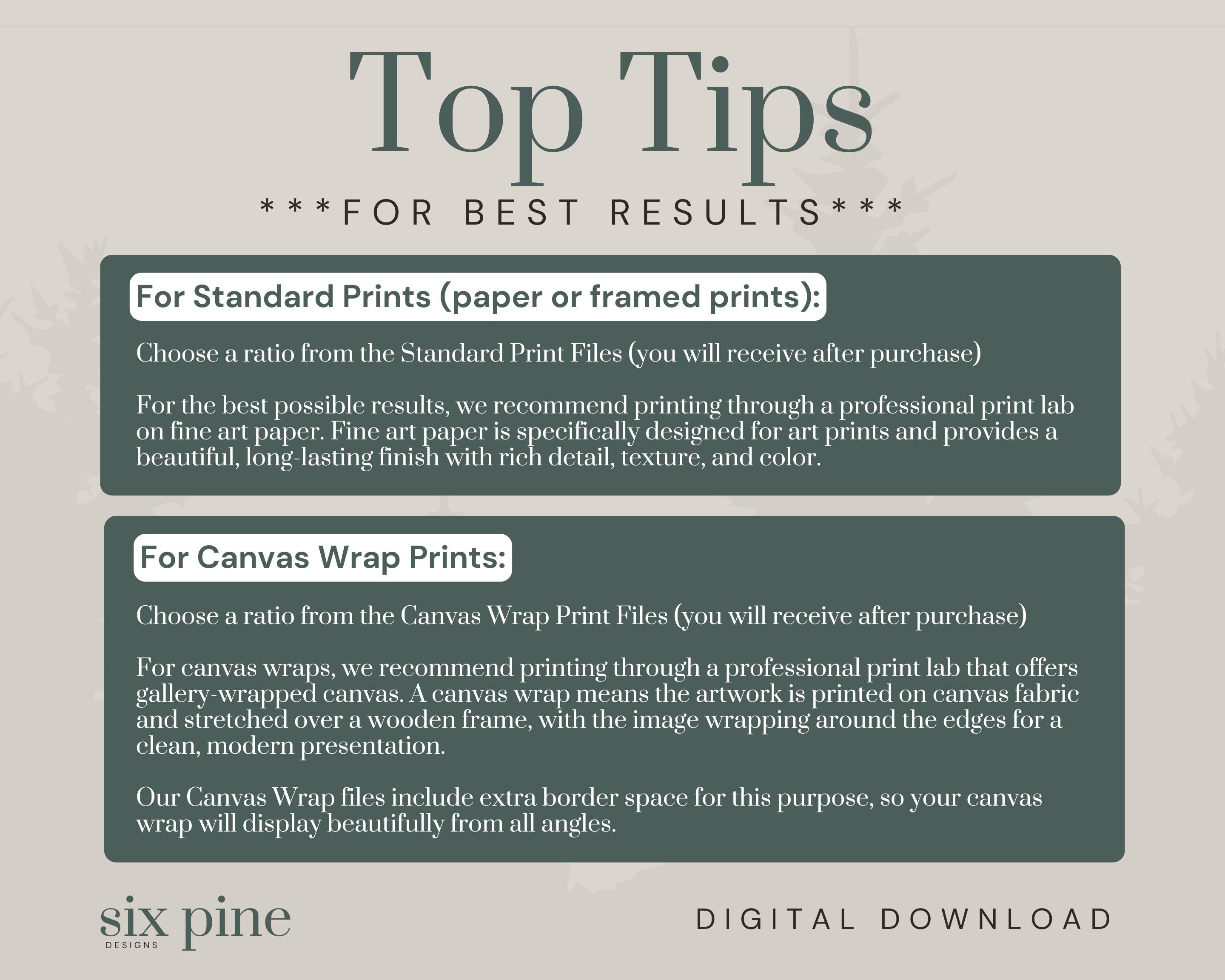 For the best possible results, we recommend printing through a professional print lab on fine art paper. Fine art paper is specifically designed for art prints and provides a beautiful, long-lasting finish with rich detail, texture, and color.