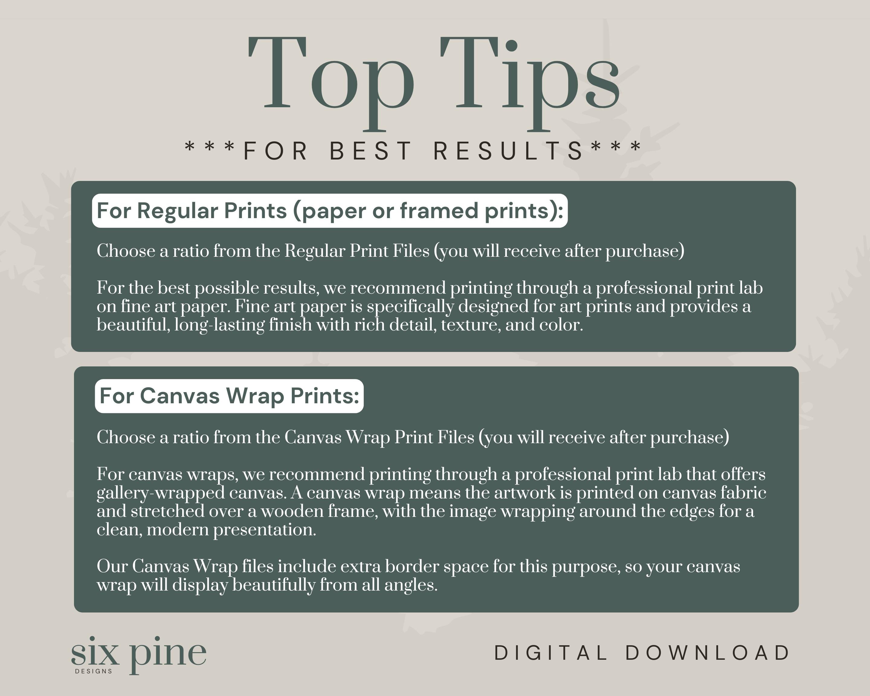For canvas wraps, we recommend printing through a professional print lab that offers gallery-wrapped canvas. A canvas wrap means the artwork is printed on canvas fabric and stretched over a wooden frame, with the image wrapping around the edges for a clean, modern presentation.