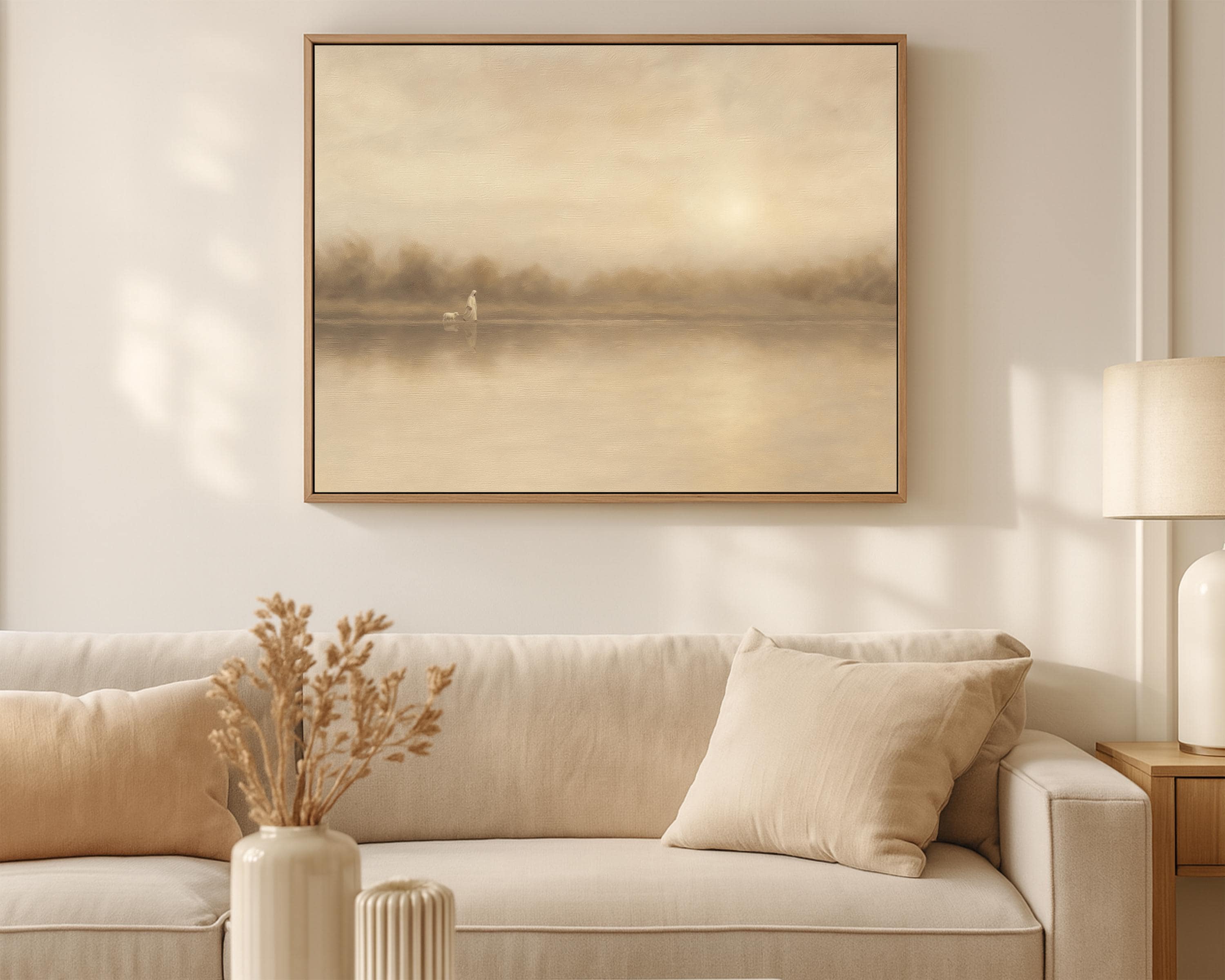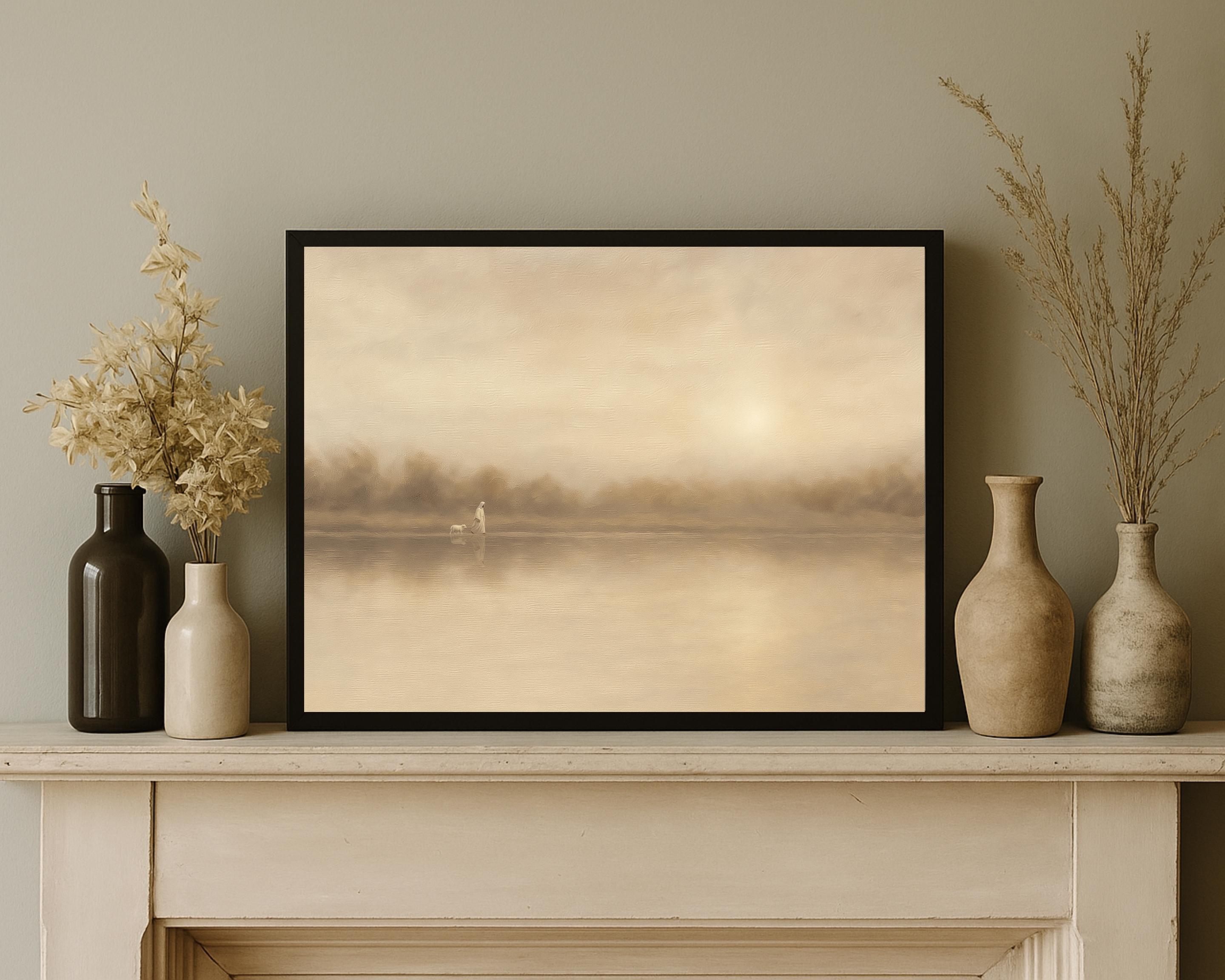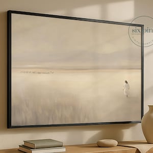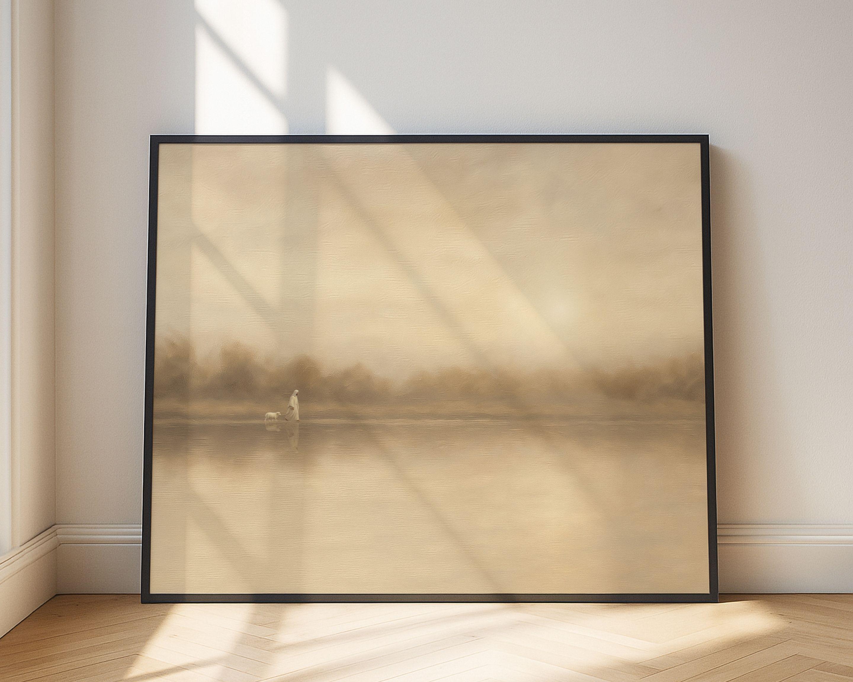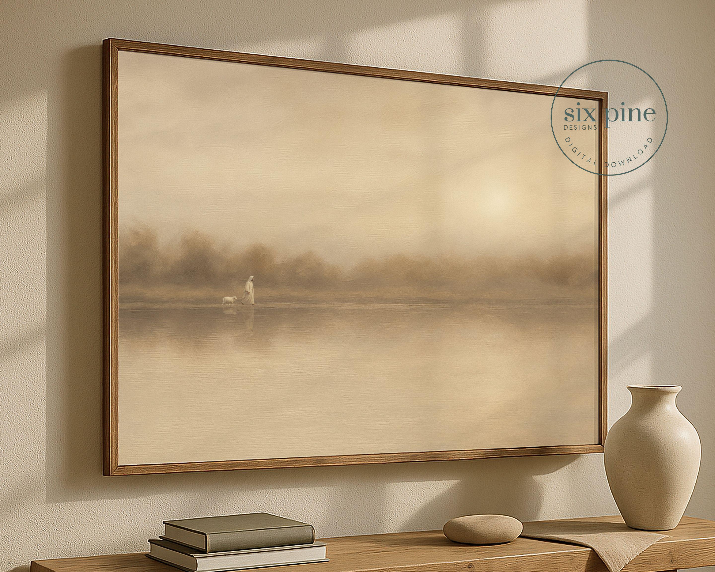 The gentle tones and soft textures reflect the comfort found in Scripture, while the subtle scene—featuring Jesus and lamb by still waters—offers a meaningful visual reminder of trust and restoration. Whether placed in a living room, bedroom, or prayer corner, this digital download serves as a serene focal point grounded in truth and simplicity.