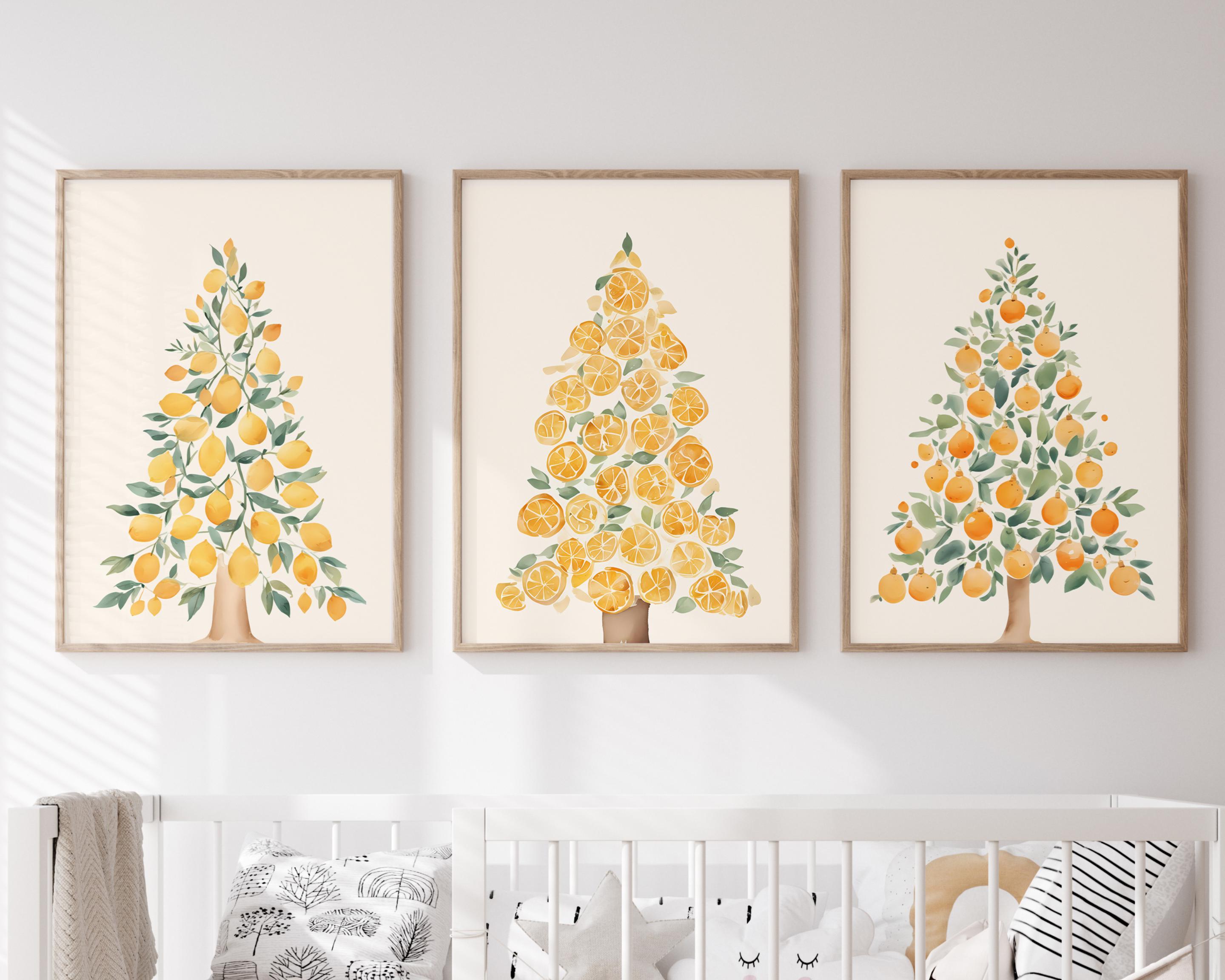 Bring a burst of sunshine into your space with this Citrus Tree Wall Art Set of 3, featuring hand-painted style illustrations of lemon, orange, and citrus slice trees. Designed in soft watercolor tones, this cheerful trio is perfect for gender neutral decor, adding a fresh and modern botanical touch to any room.