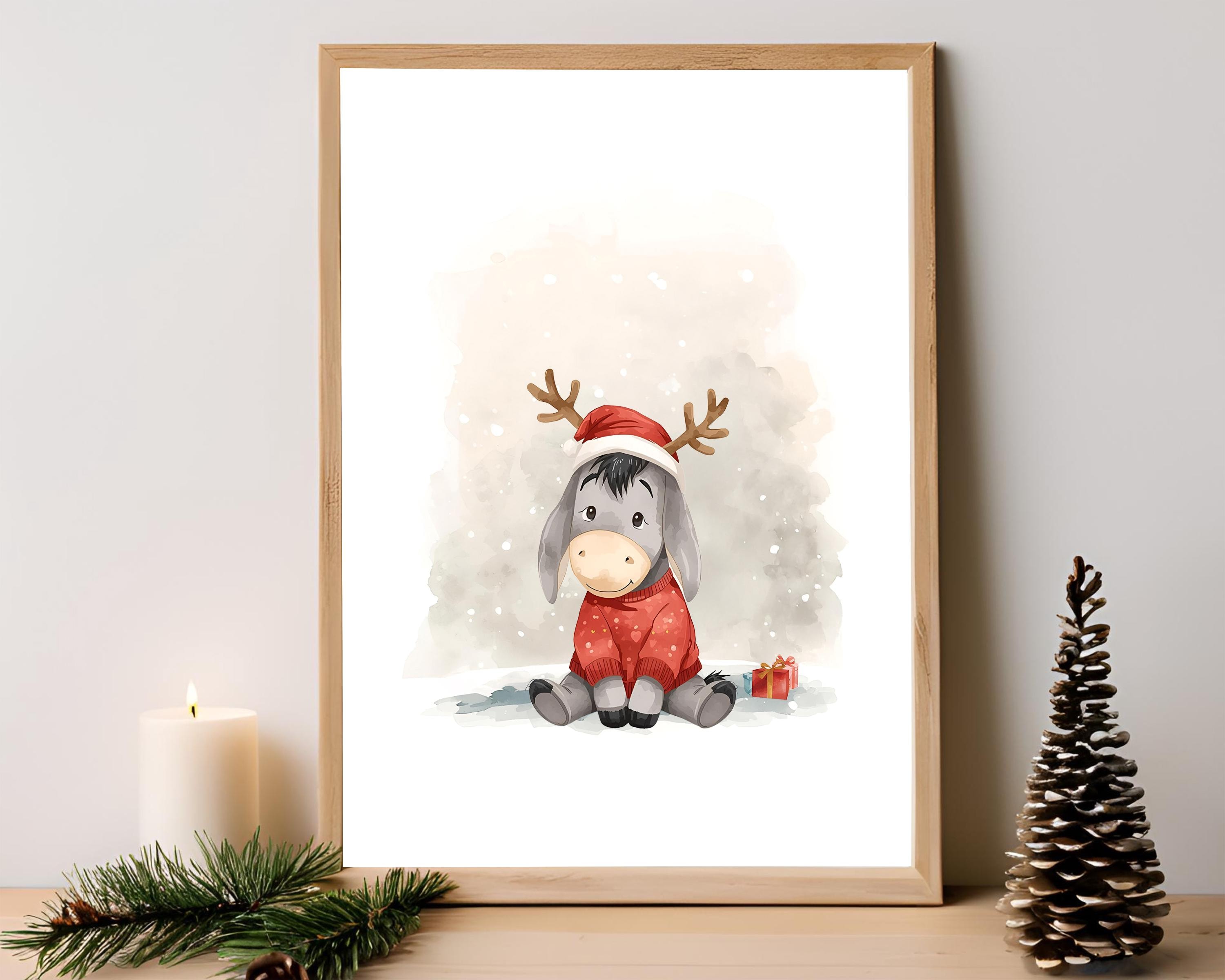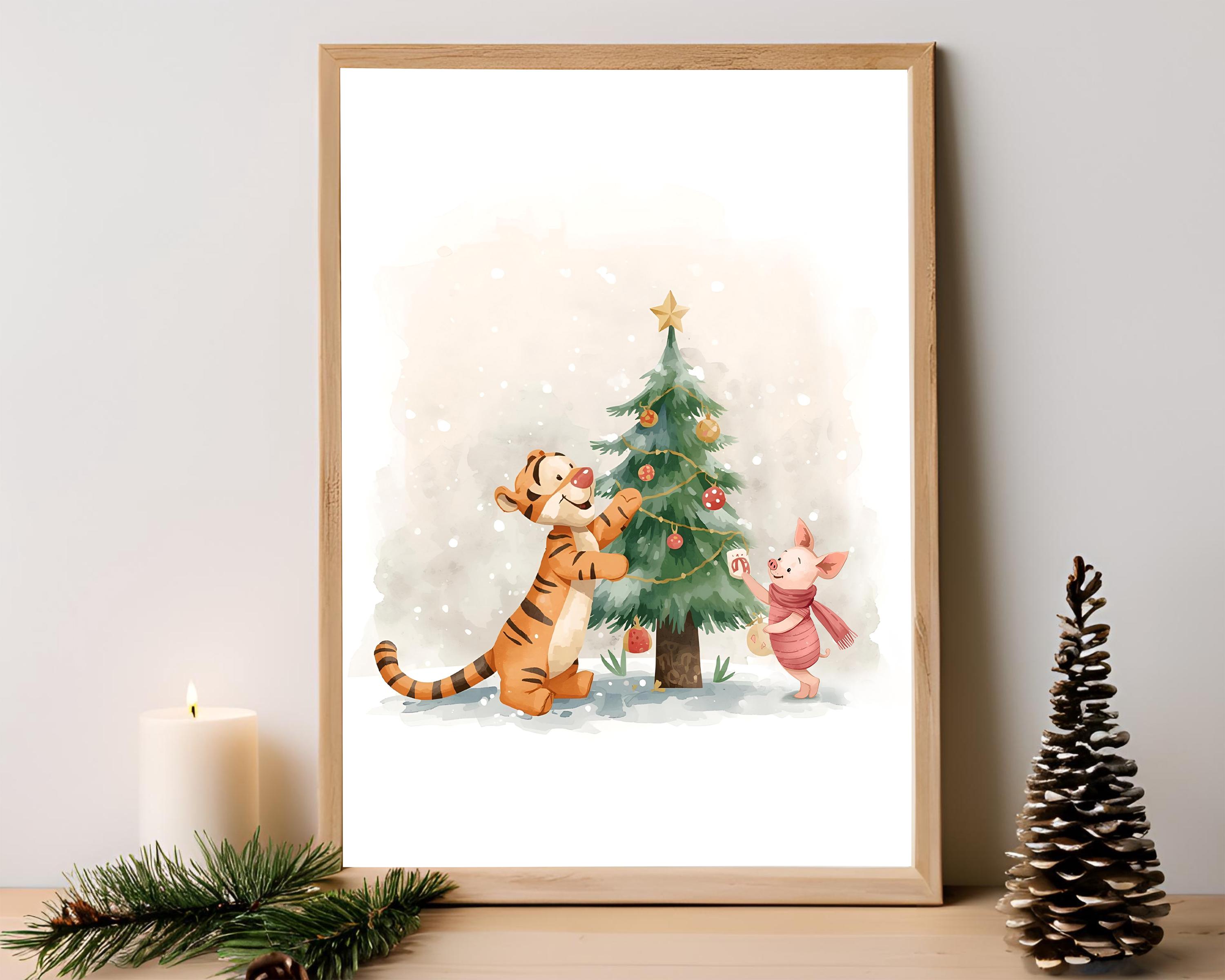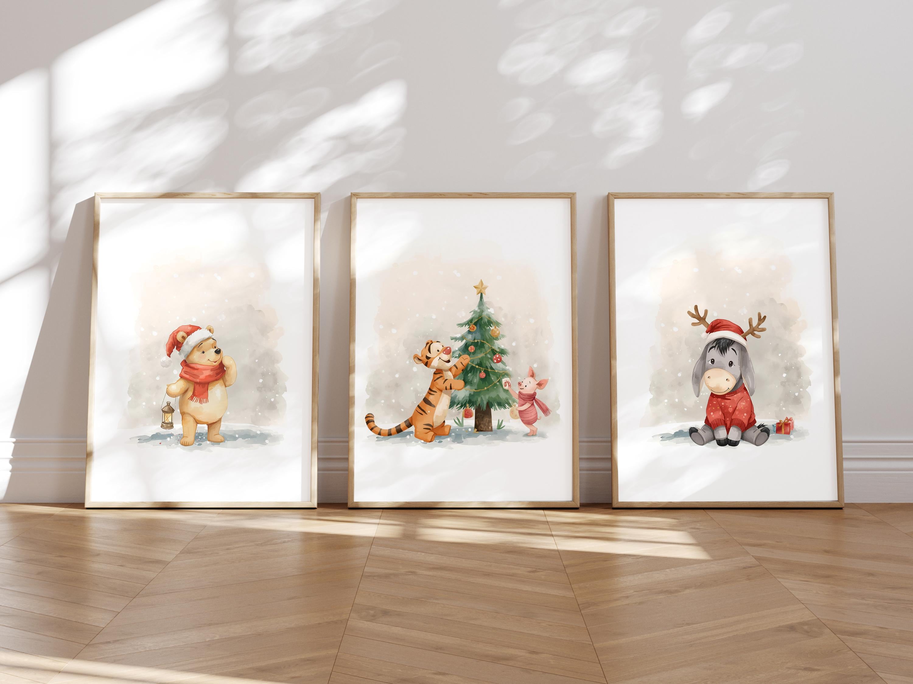 Each print captures the warmth of the season — Pooh with his lantern, Tigger and Piglet decorating the Christmas tree, and Eeyore dressed in a festive sweater and antlers — creating a heartwarming holiday wall art set that children and adults will adore.