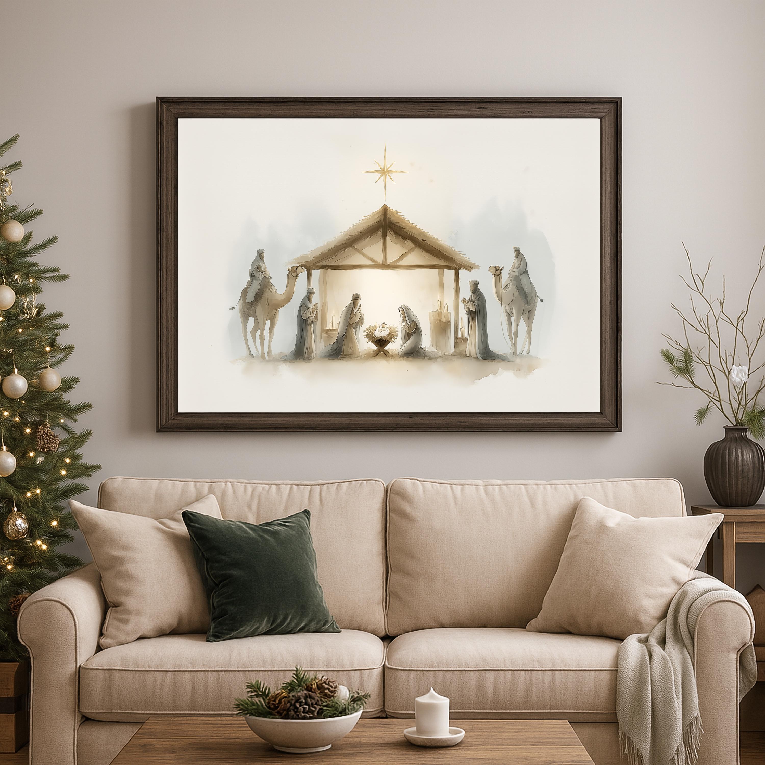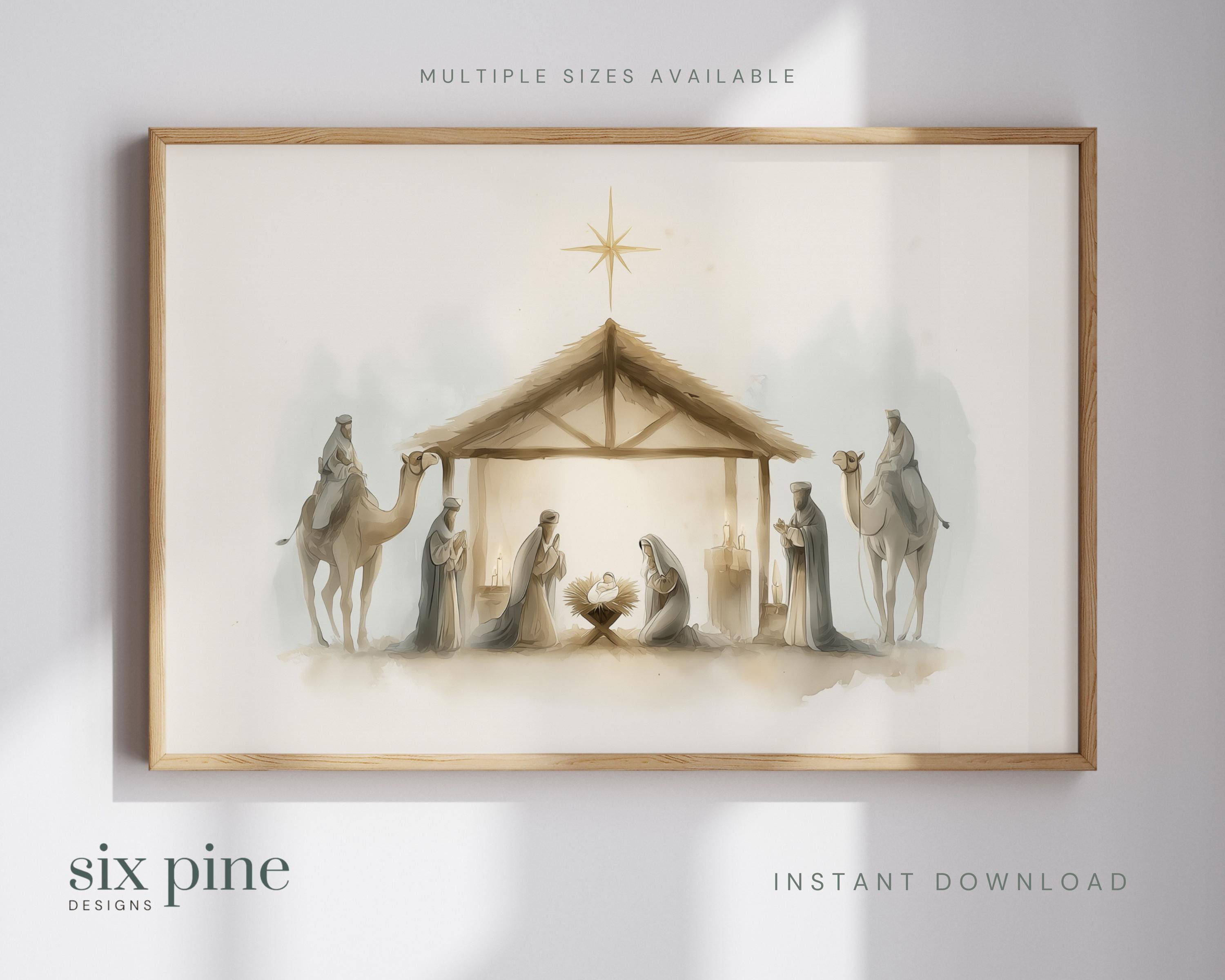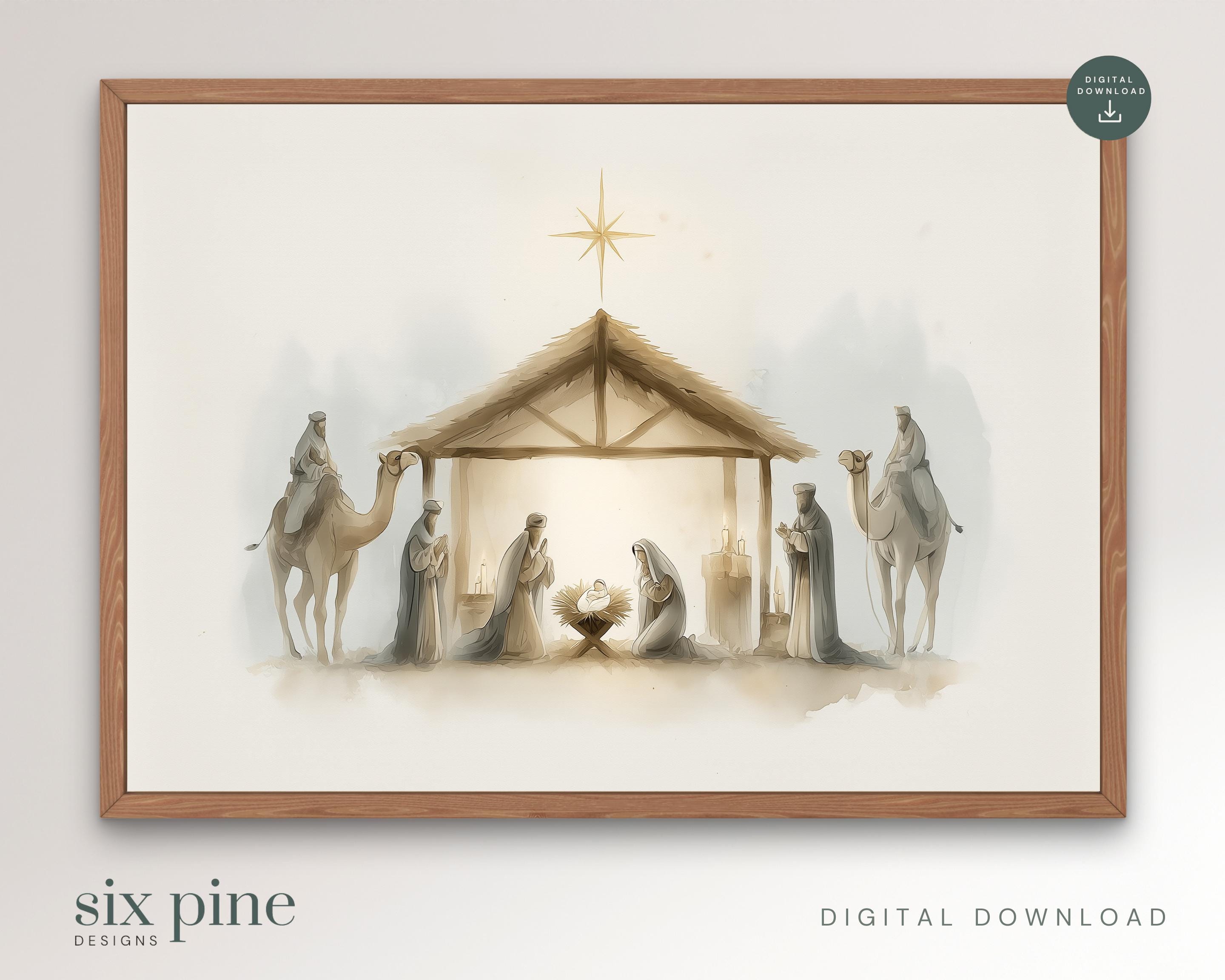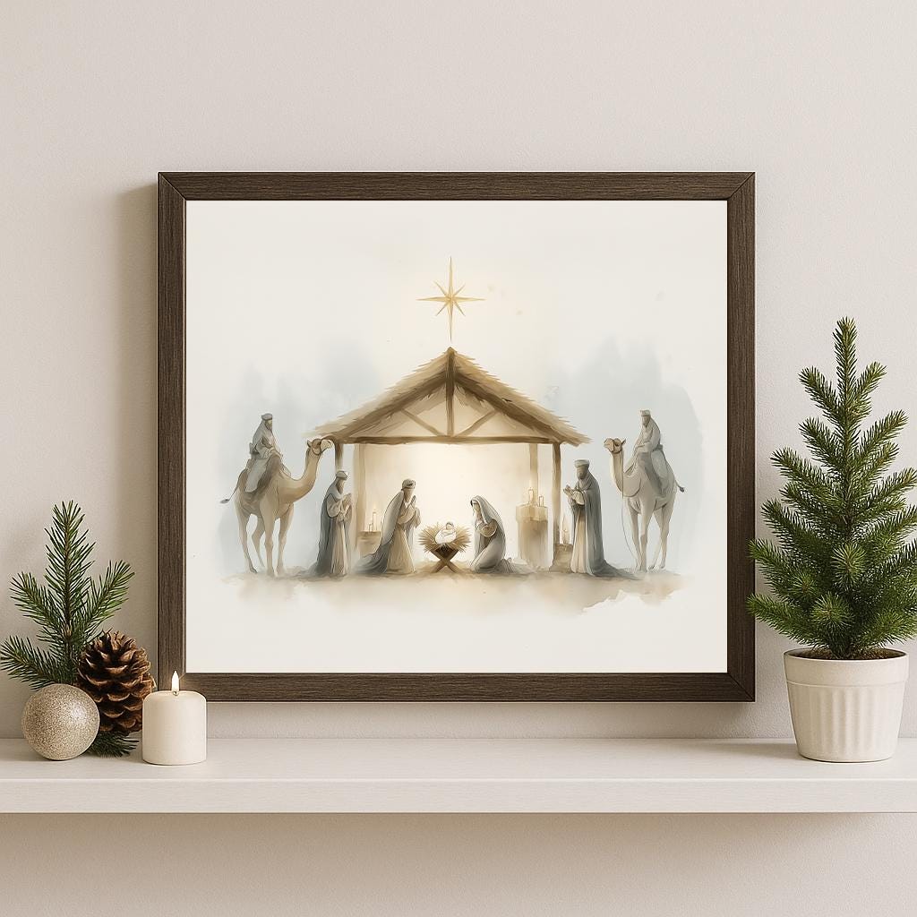 Bring the true meaning of Christmas into your home with this Nativity Scene Christmas Print — a beautifully designed watercolor nativity scene that captures the peaceful moment of Christ’s birth. This elegant Christmas printable wall art features Mary, Joseph, Baby Jesus, the Wise Men, and gentle camels under the shining star, all painted in soft neutral tones.