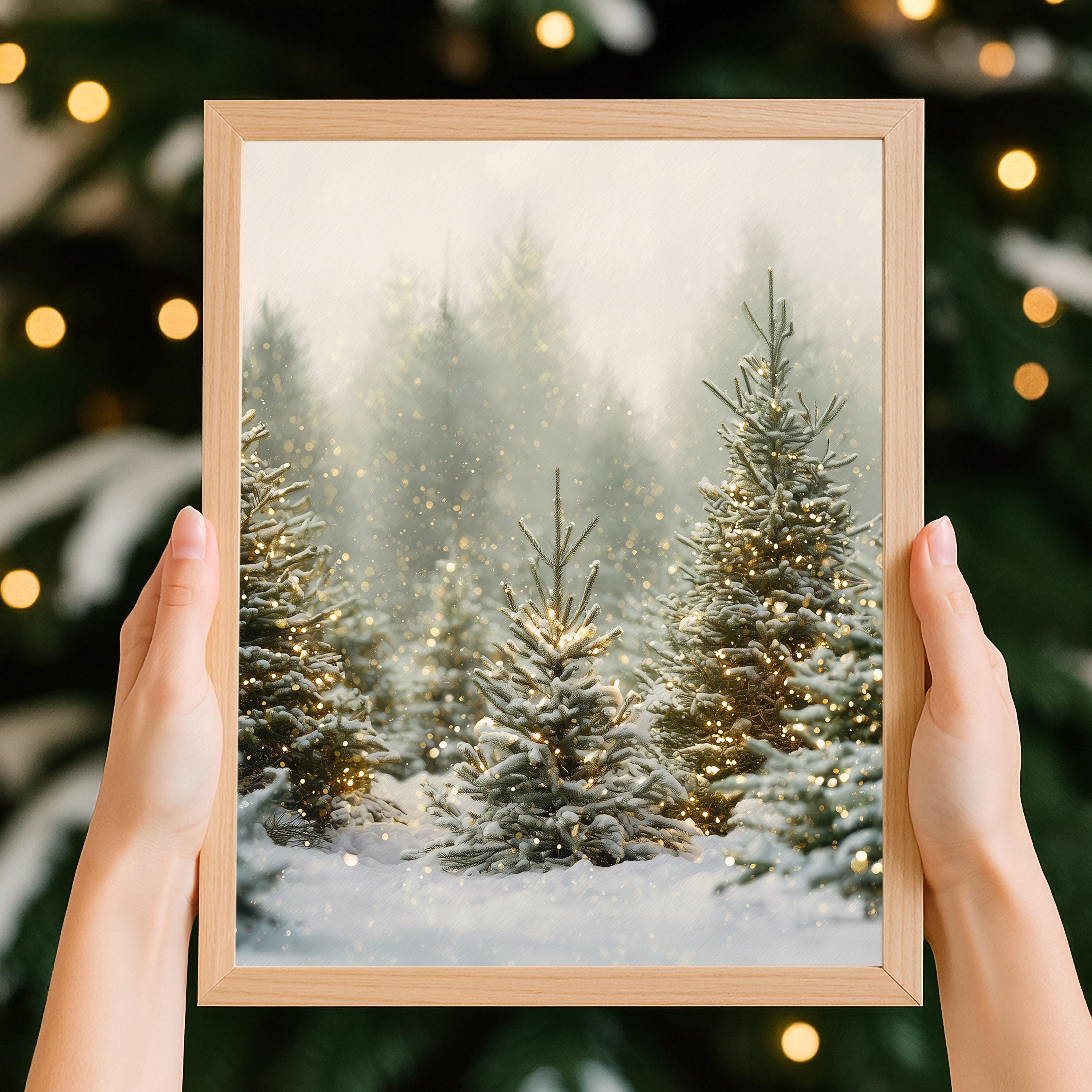 Transform your home for the season with this Winter Pine Forest Wall Art Set of 3 — a peaceful snowy Christmas Tree Farm landscape captured in soft watercolor tones. Each piece features a serene pine forest dusted with snow, glowing with gentle holiday light for that cozy rustic woodland nature scene you’ll love displaying year after year.